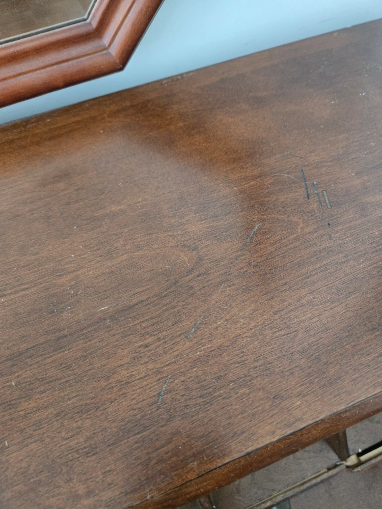 This is a beautiful antique-style secretary desk from Ashley, with a cherry wood finish. Built with solid wood, it features a drop-down writing surface, drawers, and cubbies for storage. It's perfect for adding a touch of vintage charm to your home office or living space.