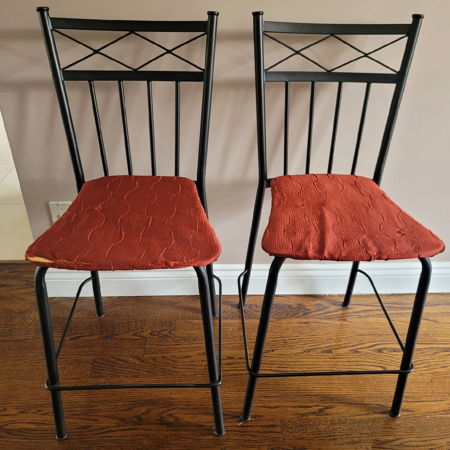 Selling a set of two bar stools. They feature a black metal frame and reddish orange fabric seats that can be refinished. The seats show some wear, as pictured, but they're still sturdy and functional! They can be refinished easily! Perfect for a kitchen island or bar area