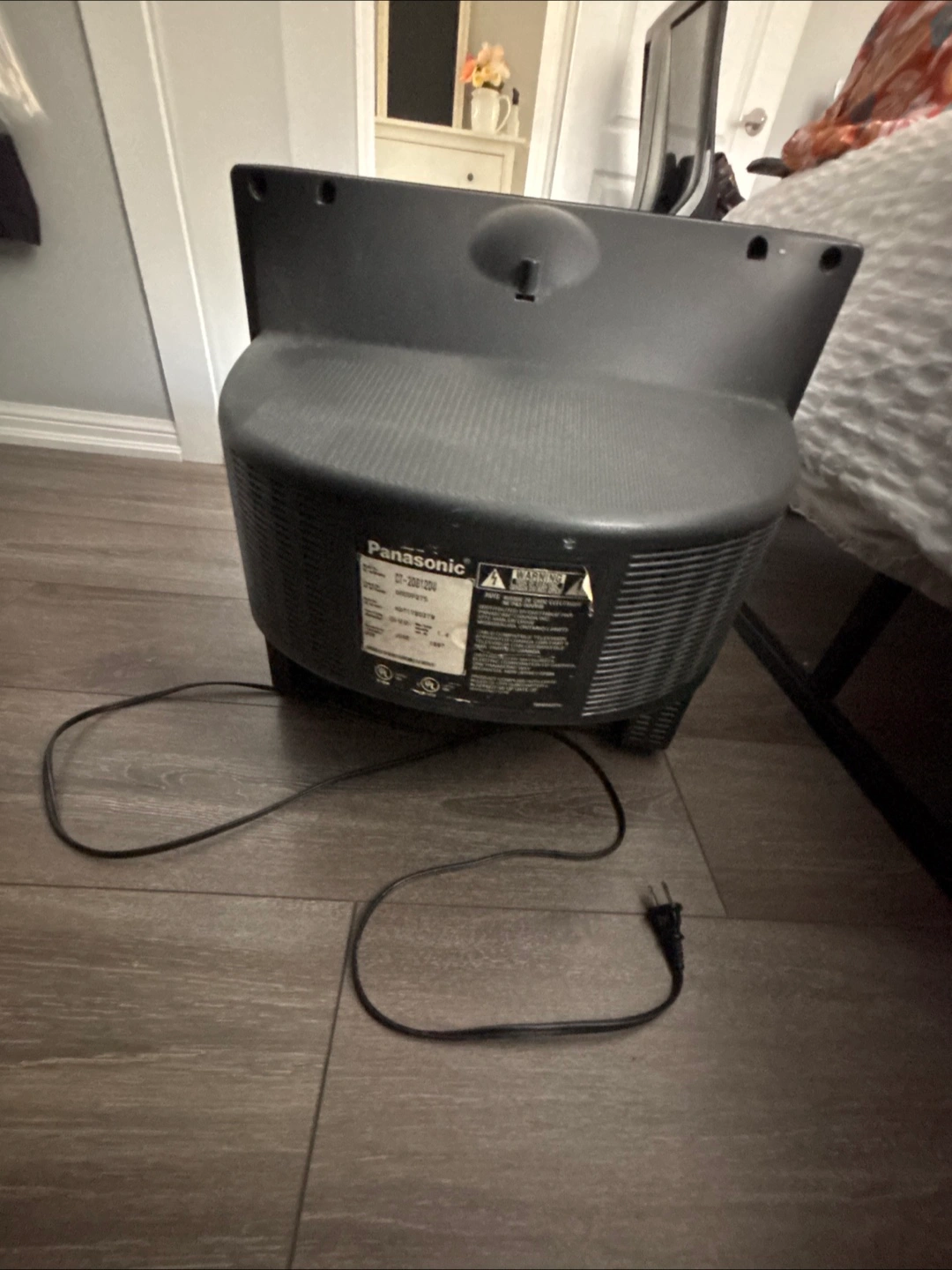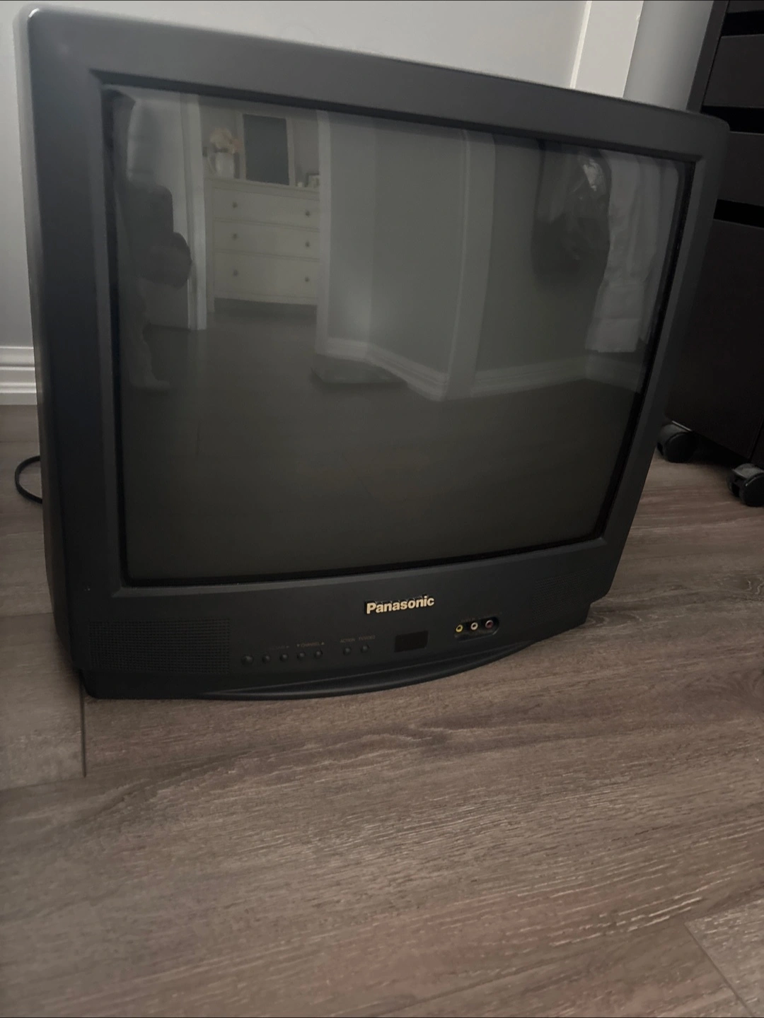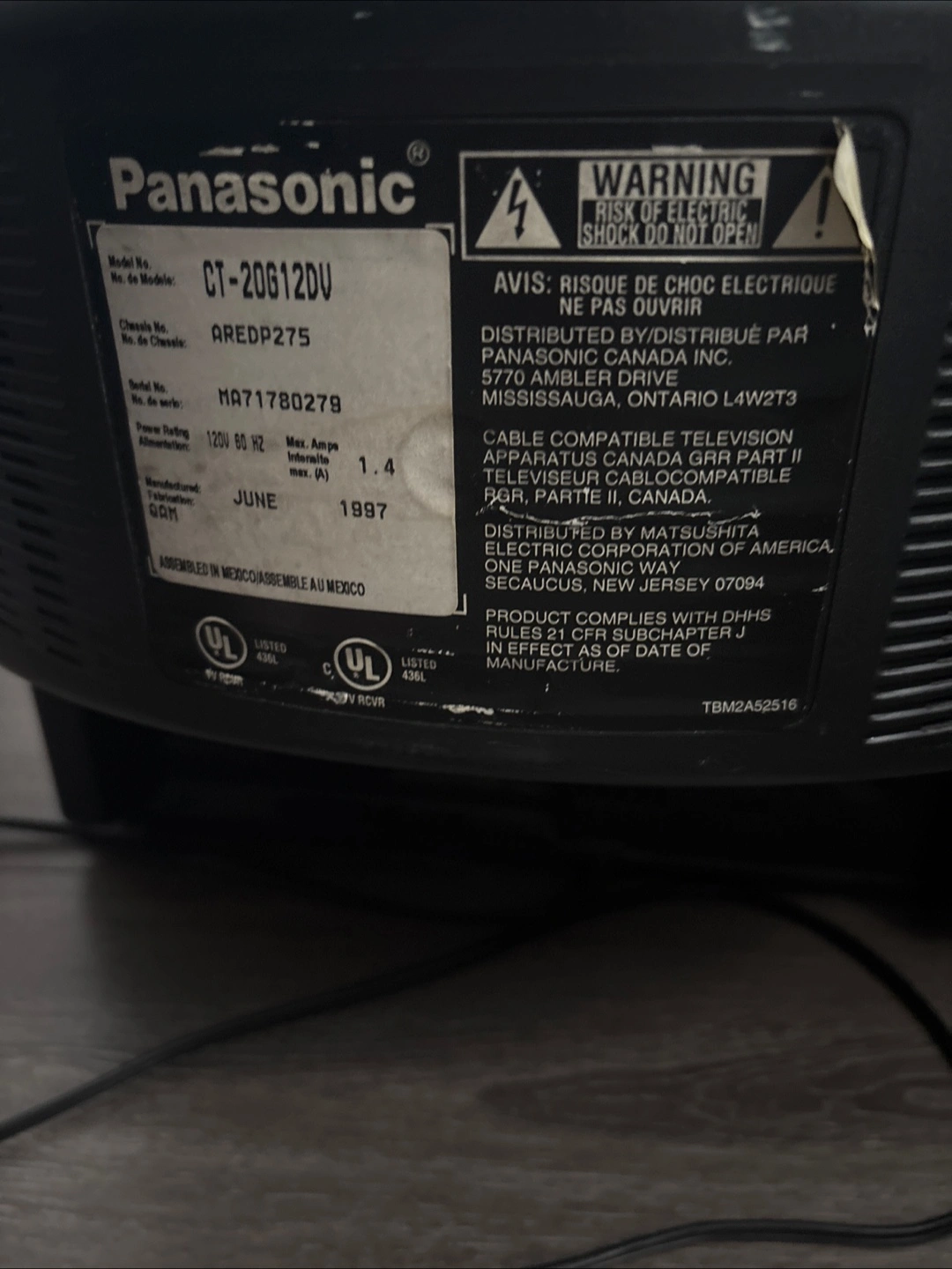 Selling a Panasonic CRT TV, model CT-20G12DU. It's a classic television set, perfect for retro gaming or as a vintage display piece. It was manufactured in June 1997. It has some signs of wear but is still in good working condition. It does not come with a remote.