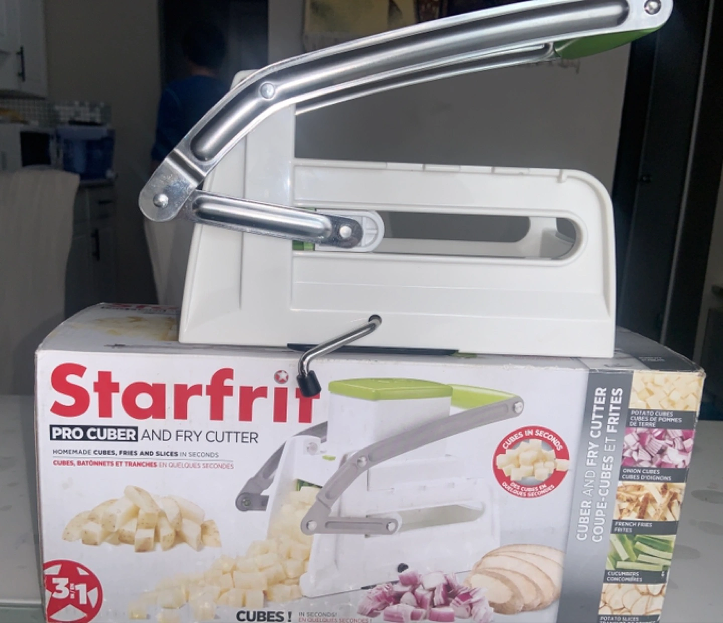 I'm selling a Starfrit Pro Cuber and Fry Cutter! This handy kitchen gadget makes creating cubes, fries, and slices a breeze. It works in seconds, perfect for potatoes, onions, and more. The box is included!