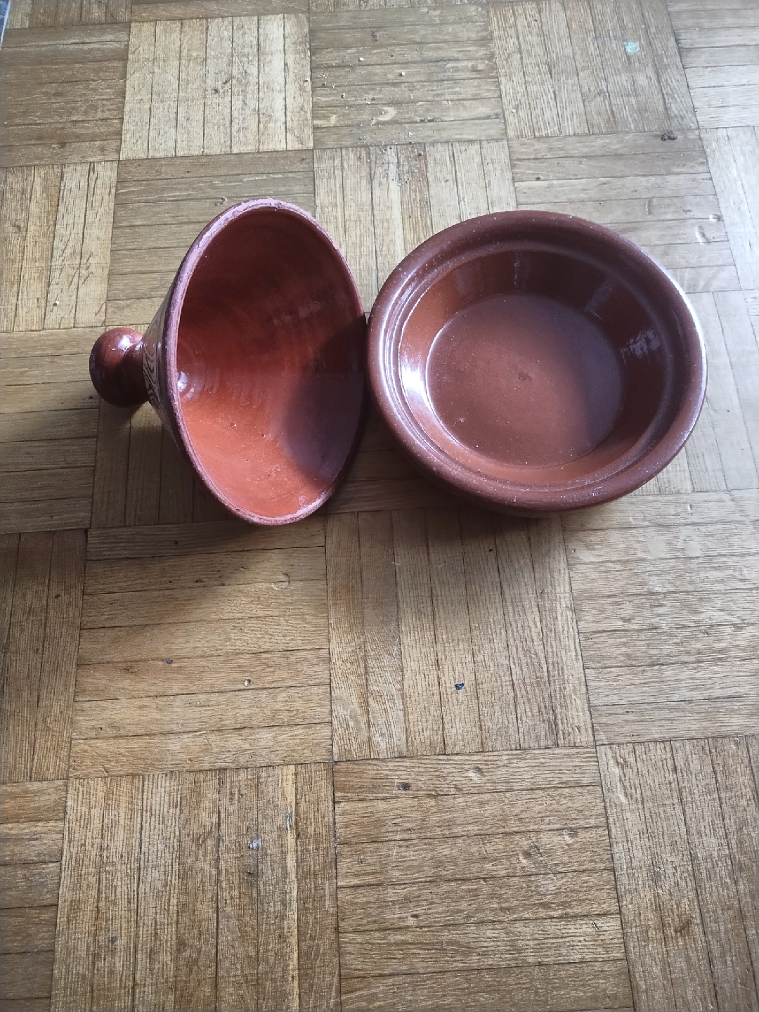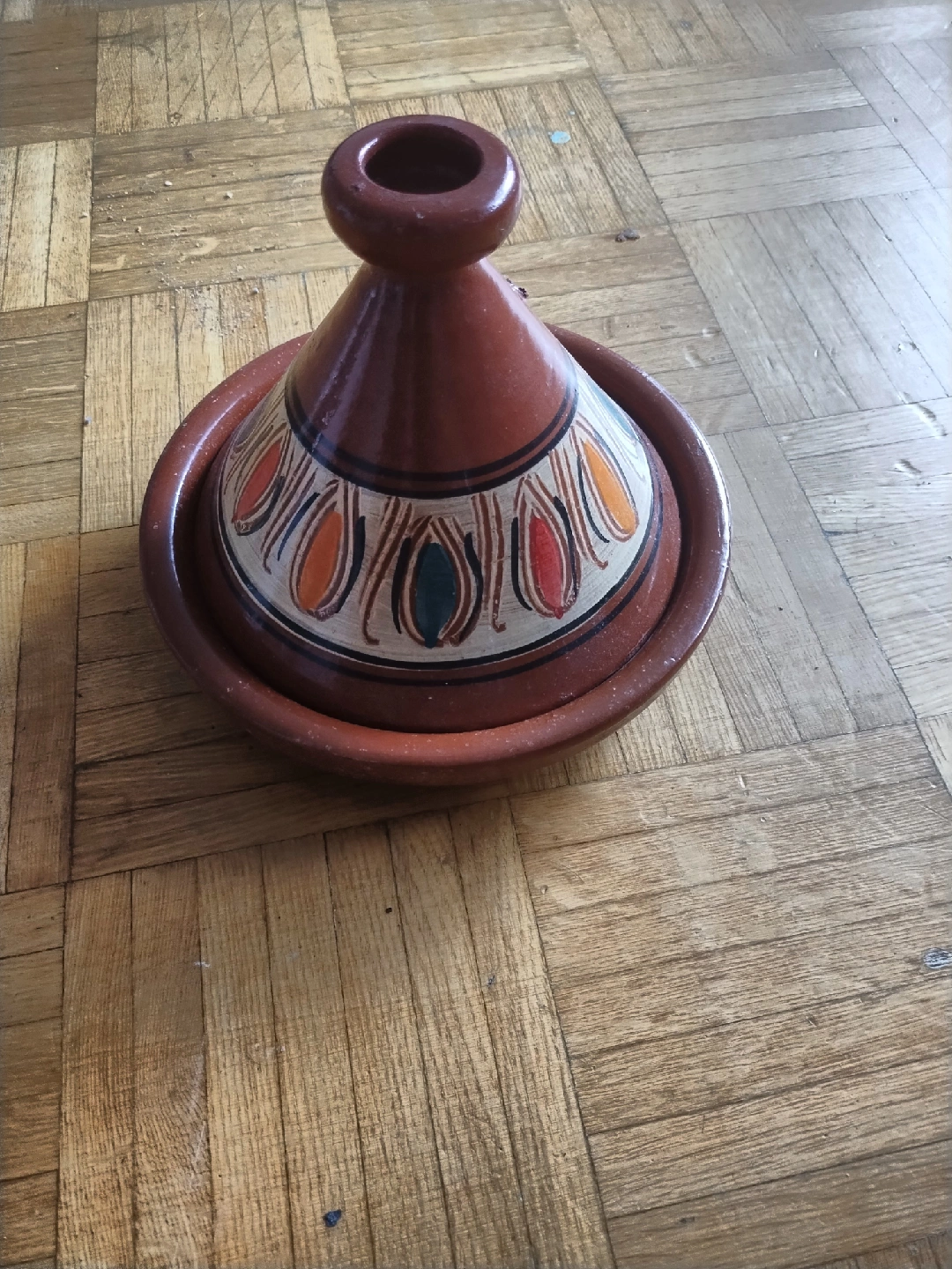 Selling a traditional Moroccan tagine. It's in great shape and ready for cooking up some delicious meals! The tagine is a beautiful terracotta colour with hand-painted designs around the top. Perfect for slow-cooking stews and other dishes.