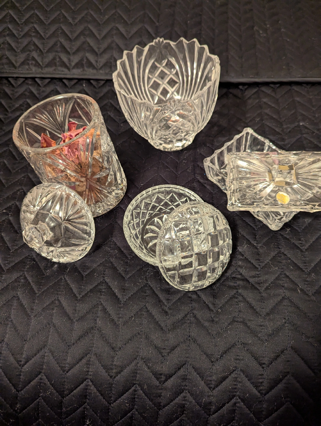 Four piece crystal glassware set, includes 3 pieces with lids and one open bowl.