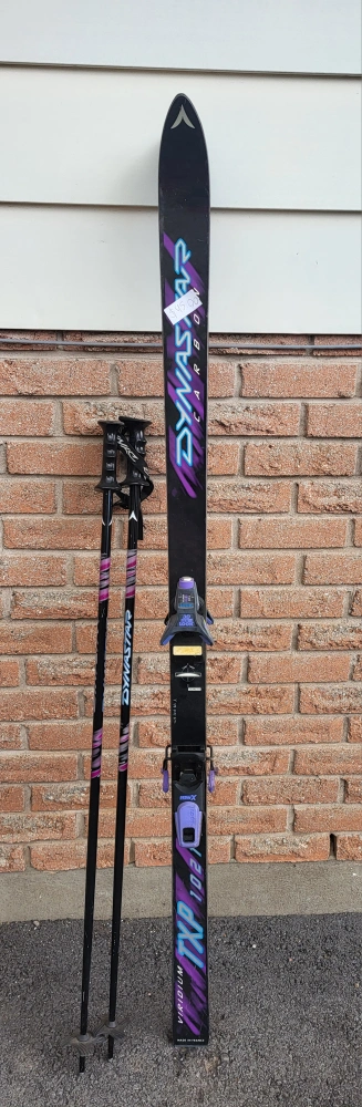 Selling a pair of Dynastar VTXP 102 skis, complete with poles. They feature a sleek black and purple design. The skis are marked with 'Dynastar' and 'VTXP 102'.