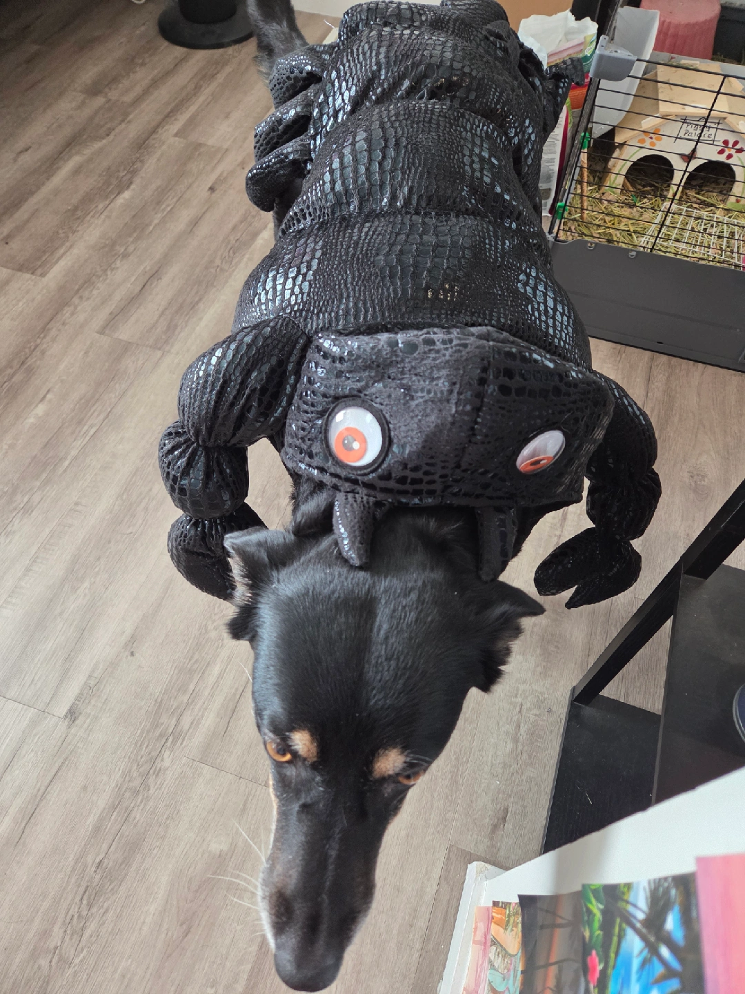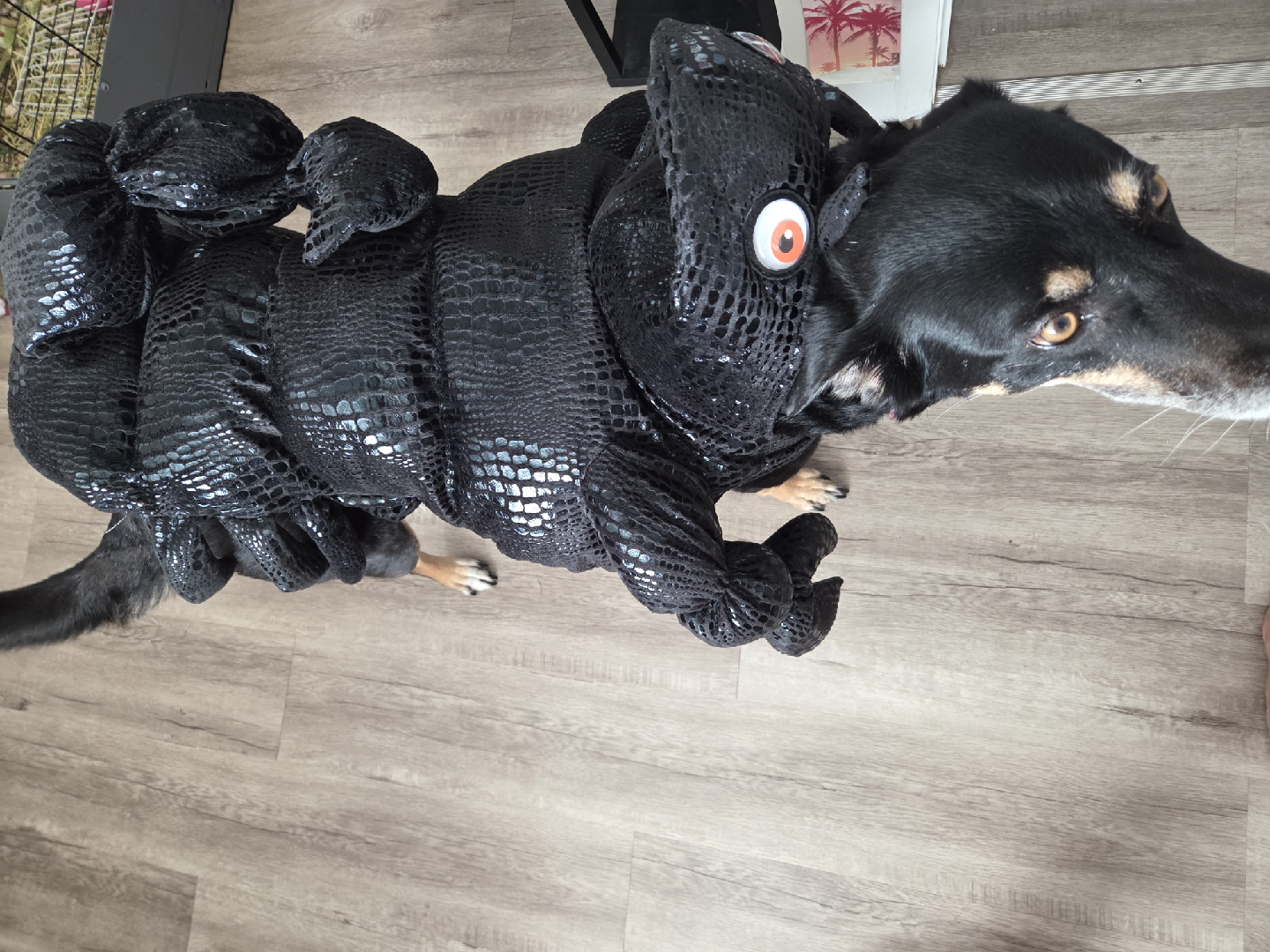 Selling a gently used scorpion costume for your furry friend! It's black and features a textured, scale-like design. Perfect for Halloween or a fun dress-up occasion for your pet