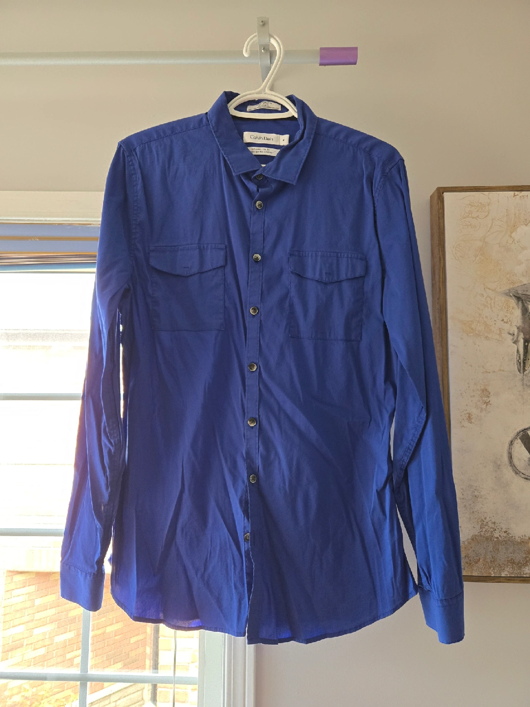 Selling a stylish Calvin Klein button-down shirt in a vibrant blue colour. It's a size small and in great condition. Perfect for a casual or dressed-up look!