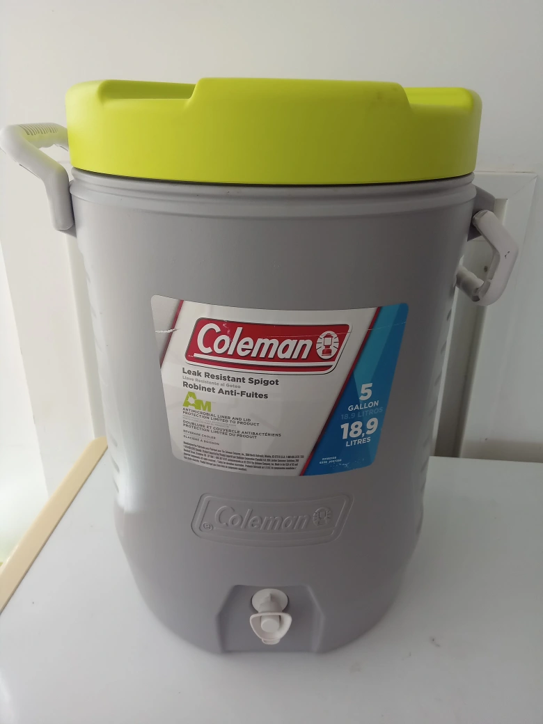 Coleman 5 Gallon (18.9 Litres) water cooler with a leak-resistant spigot. It features an antimicrobial liner and lid for protection against odour and stain causing bacteria. Perfect for camping or outdoor activities