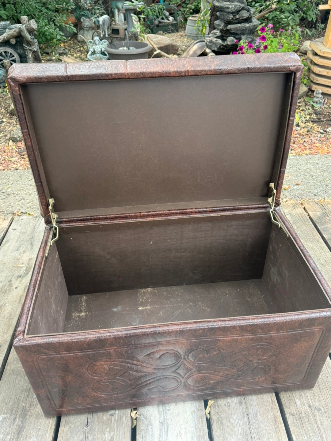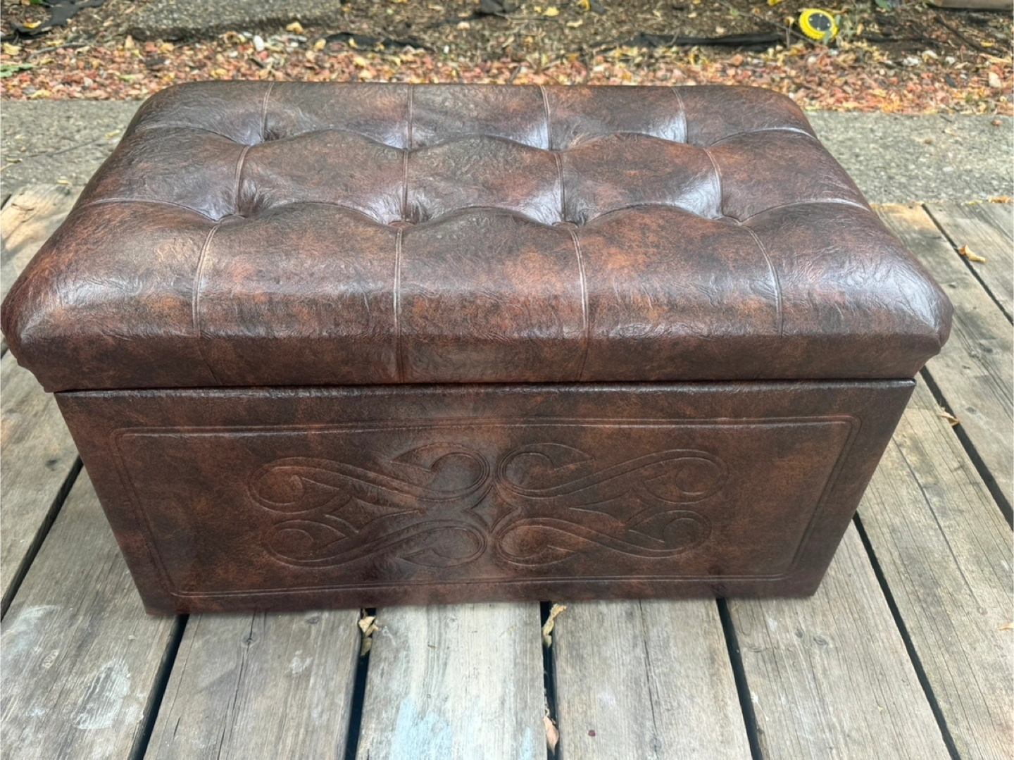 Here's a lovely brown faux leather storage ottoman! It's in great shape and perfect for adding some extra seating and storage to your living room or bedroom. The ottoman has a tufted top and a decorative design on the sides. It's a stylish and functional piece of furniture!