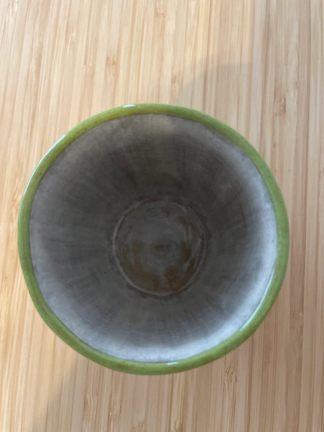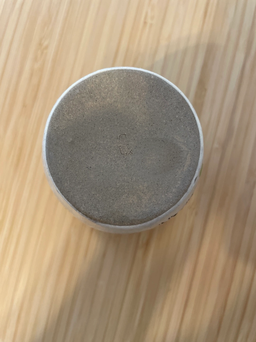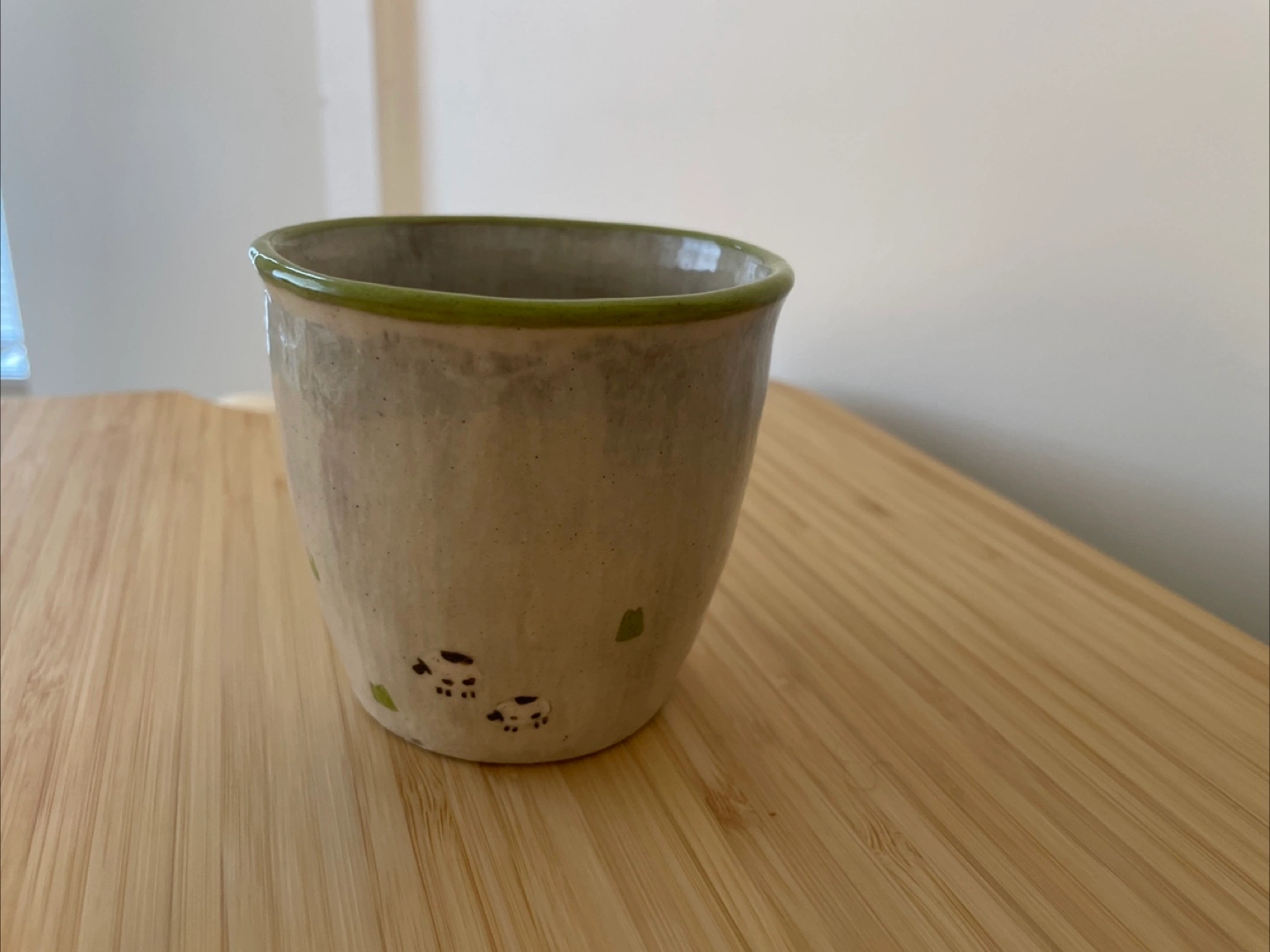 Selling a unique handmade ceramic cup! It features a lovely light green trim and subtle leaf designs. Perfect for your morning coffee or tea!