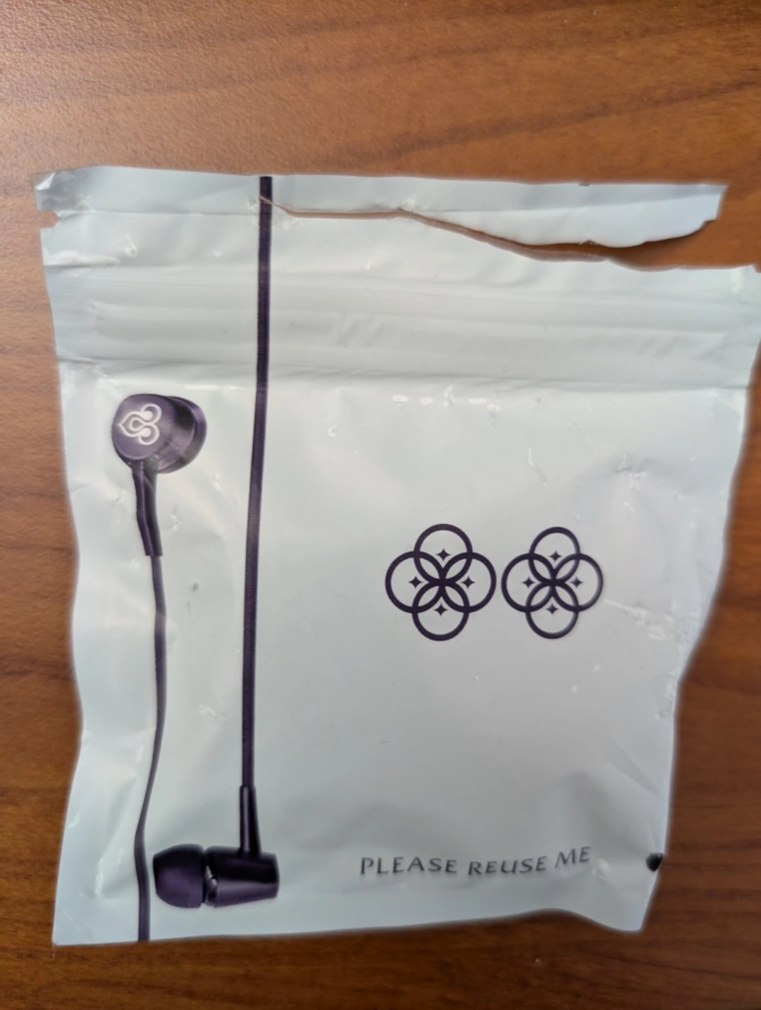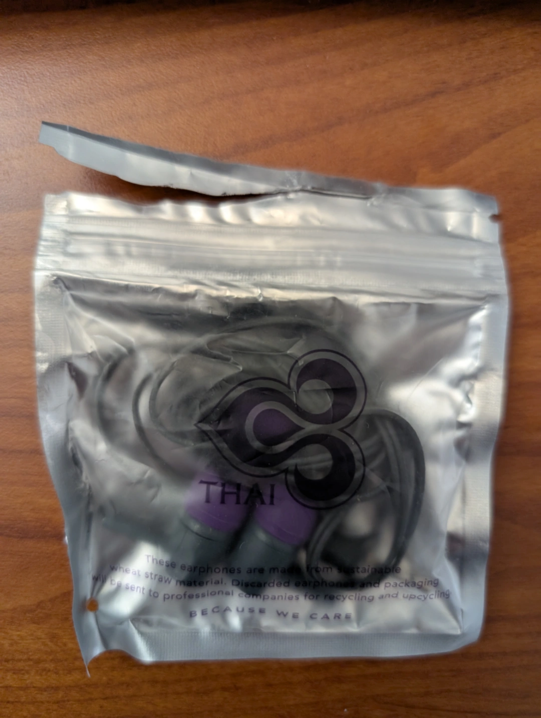 These earphones are made from sustainable wheat straw material. The packaging should be sent to professional companies for recycling and upcycling