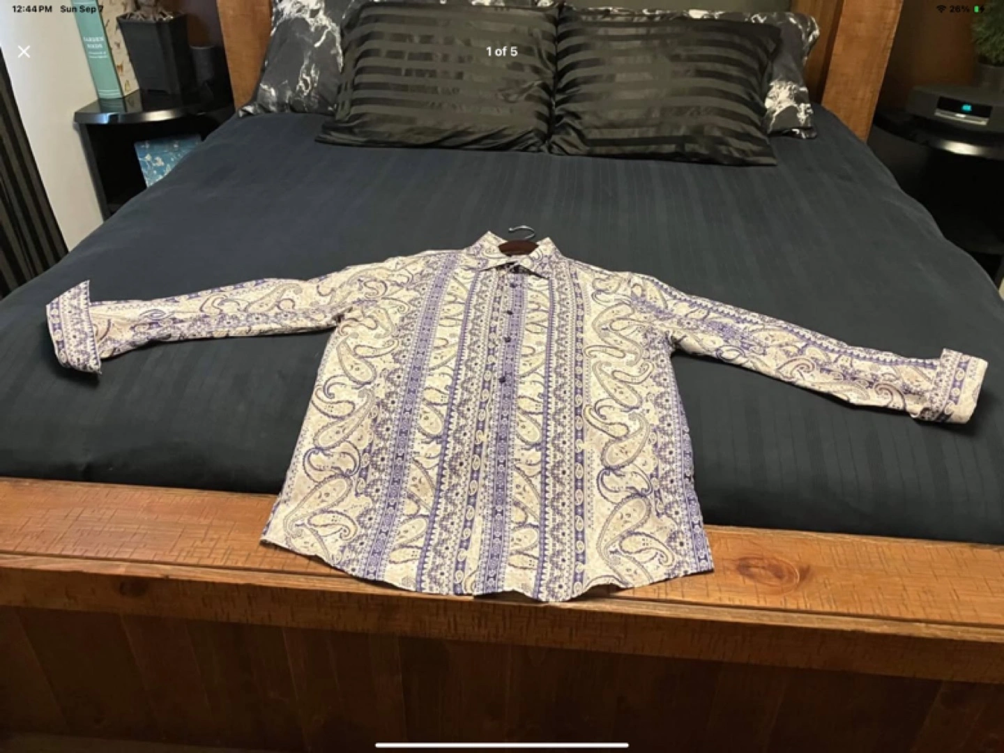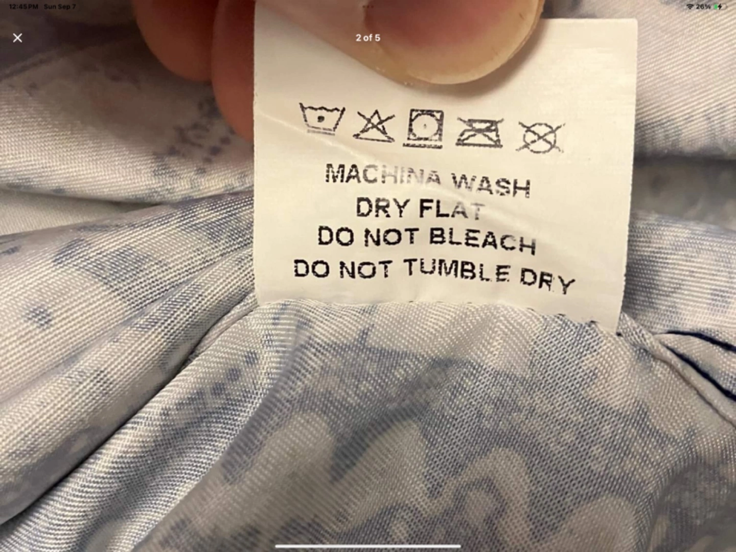 Here's a long-sleeve designer shirt with a unique pattern! The tag says to machine wash and dry flat. Please do not bleach or tumble dry