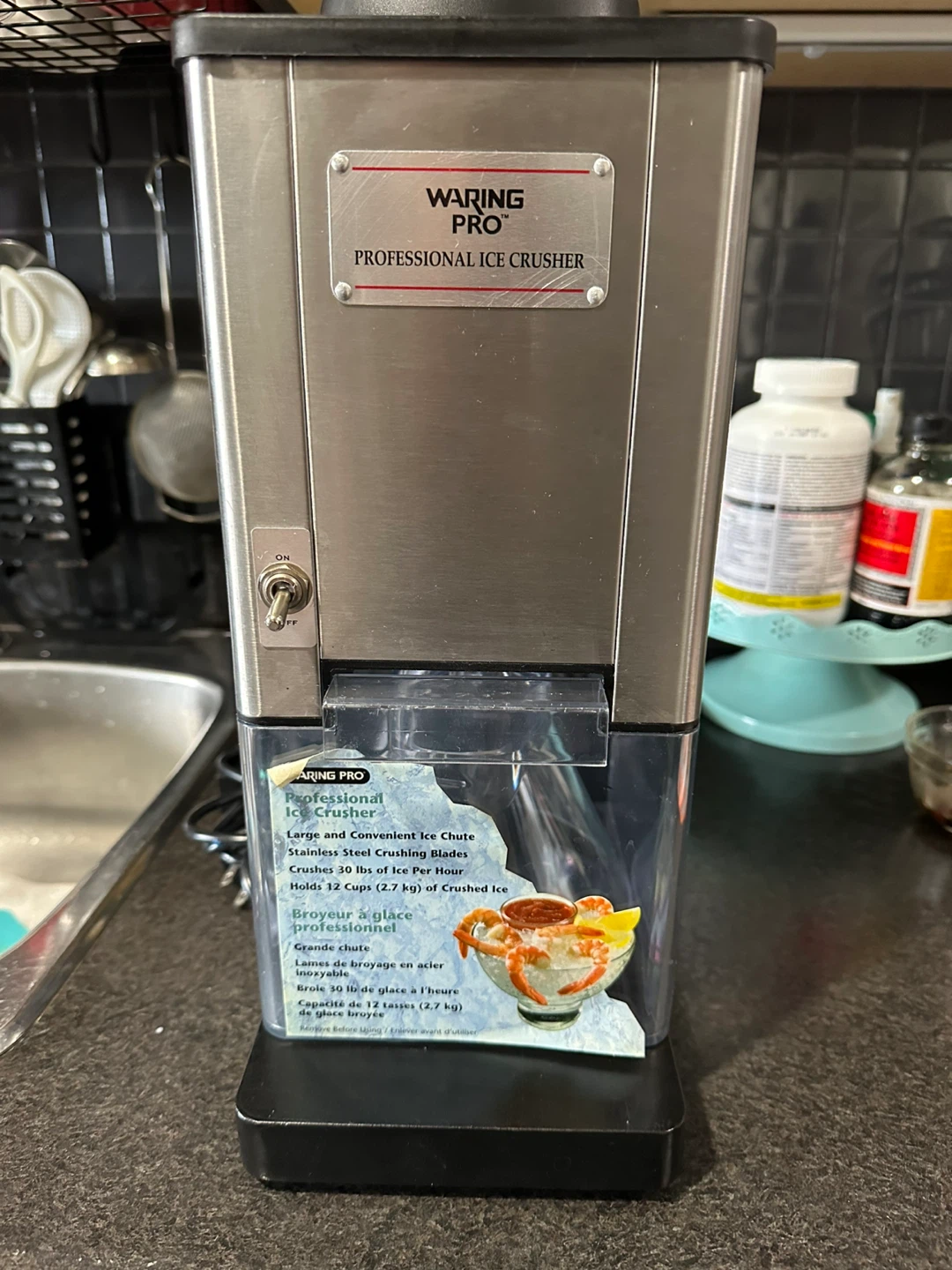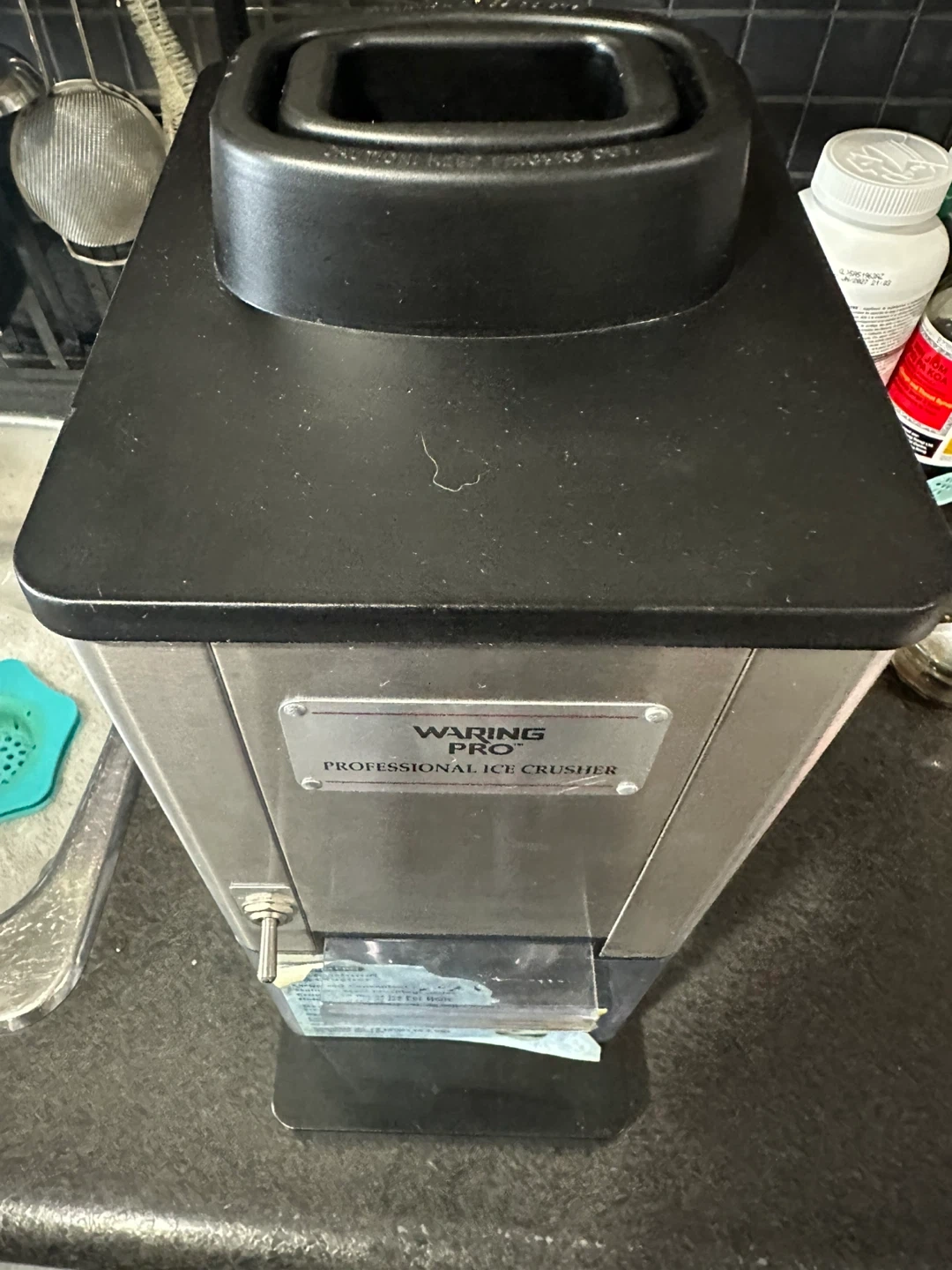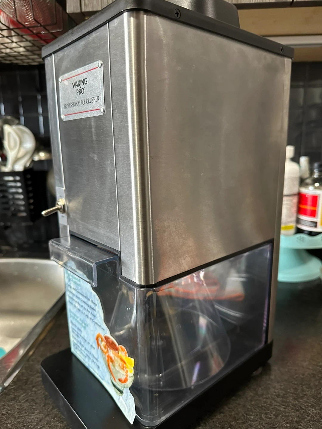 Selling a Waring Pro Professional Ice Crusher. It has a large and convenient ice chute and stainless steel crushing blades. It crushes 30 lbs of ice per hour and holds 12 cups of crushed ice.