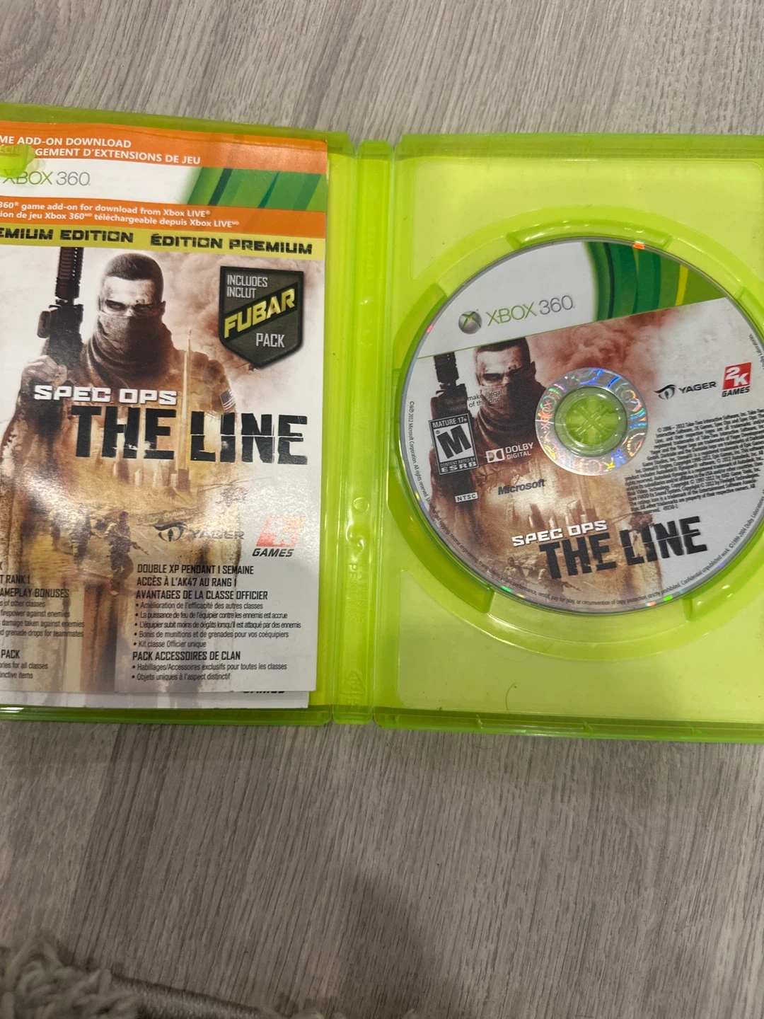 Selling a copy of Spec Ops: The Line for the Xbox 360. This is the premium edition, which includes the FUBAR pack. The game is in good condition and ready for a new player to enjoy!willing to trade for funko pops