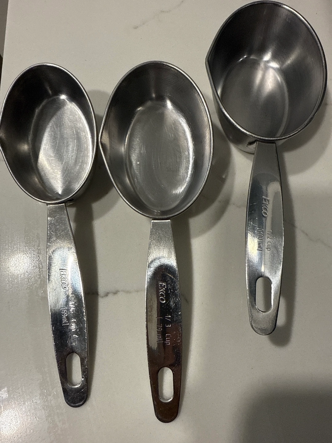 Selling a set of three Ekco stainless steel measuring cups. The set includes 1/4 cup (59ml), 1/3 cup (79ml), and 1/2 cup (118ml) sizes. They're in great condition and ready for a new kitchen! Cash and pick up.