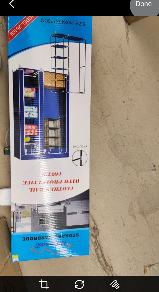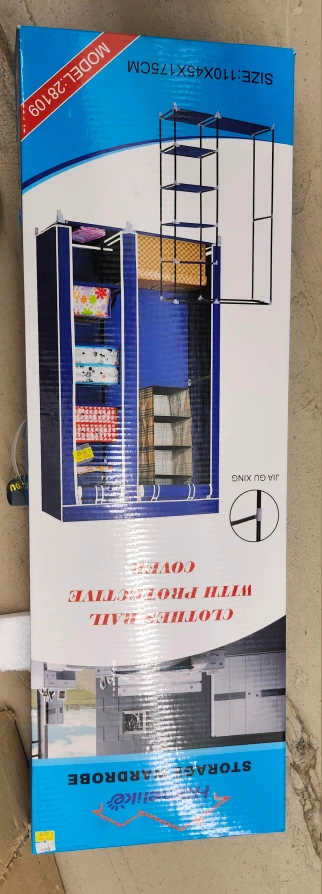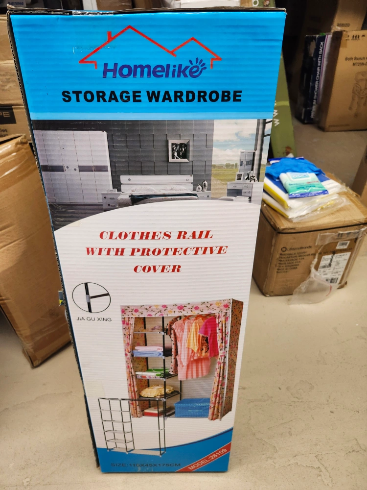 Selling a brand new, still-in-box portable storage wardrobe! It features a clothes rail with a protective cover. The wardrobe is blue and measures approximately 110x45x175cm. Great for adding extra storage space!