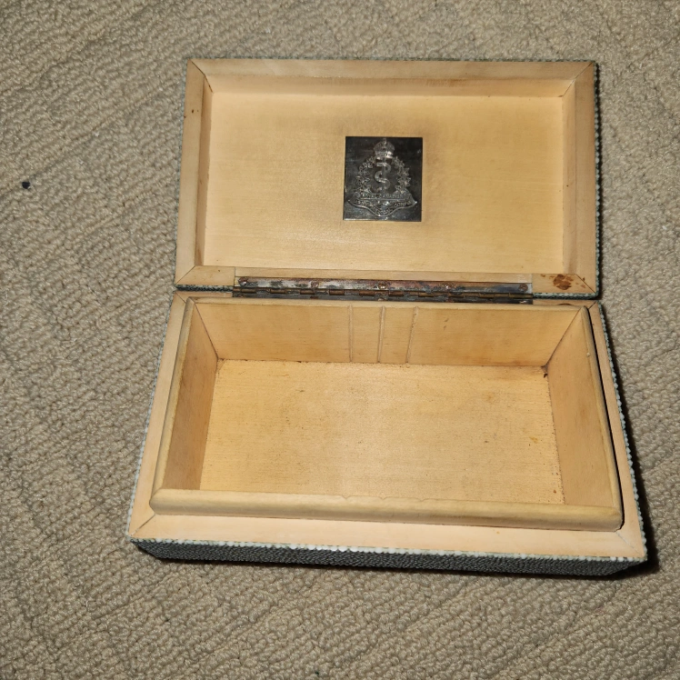 Here's a rare vintage box with a unique design! It features the Royal Canadian Medical Corps emblem on the inside lid. The exterior has a textured finish. It's a great piece for collectors or anyone who appreciates vintage items. measures 7&1/8x4&1/8 x2&5/8 inches.