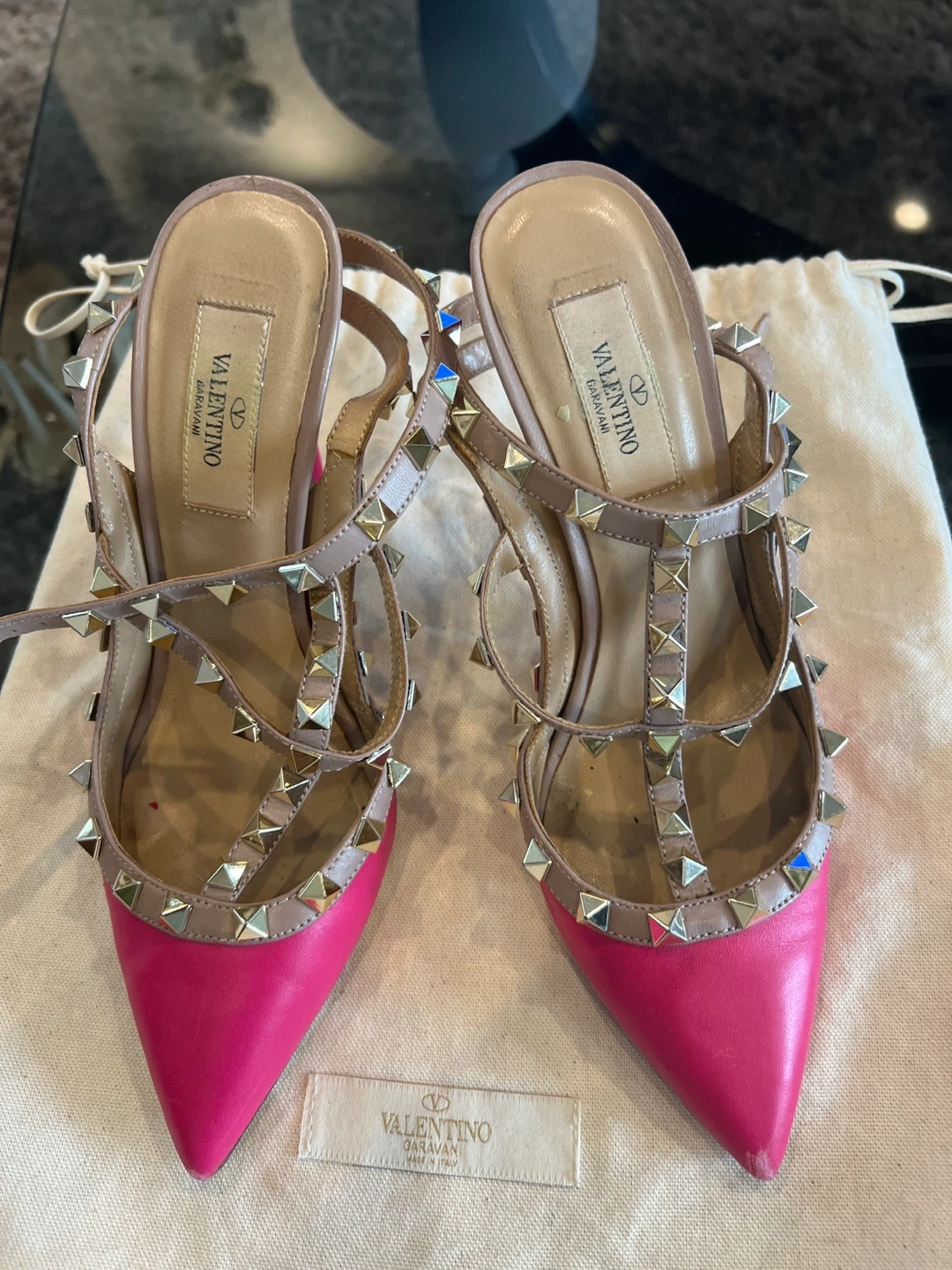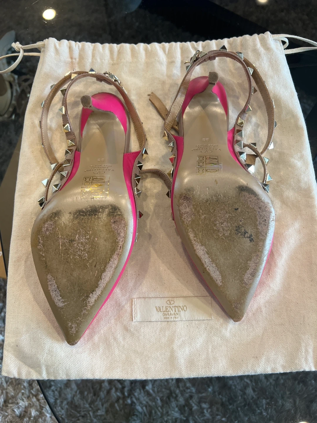 10Selling a pair of Valentino Garavani Rockstud heels in a vibrant pink! These heels are a size 38 and feature the iconic Rockstud detailing. They show signs of wear, but still have lots of life left