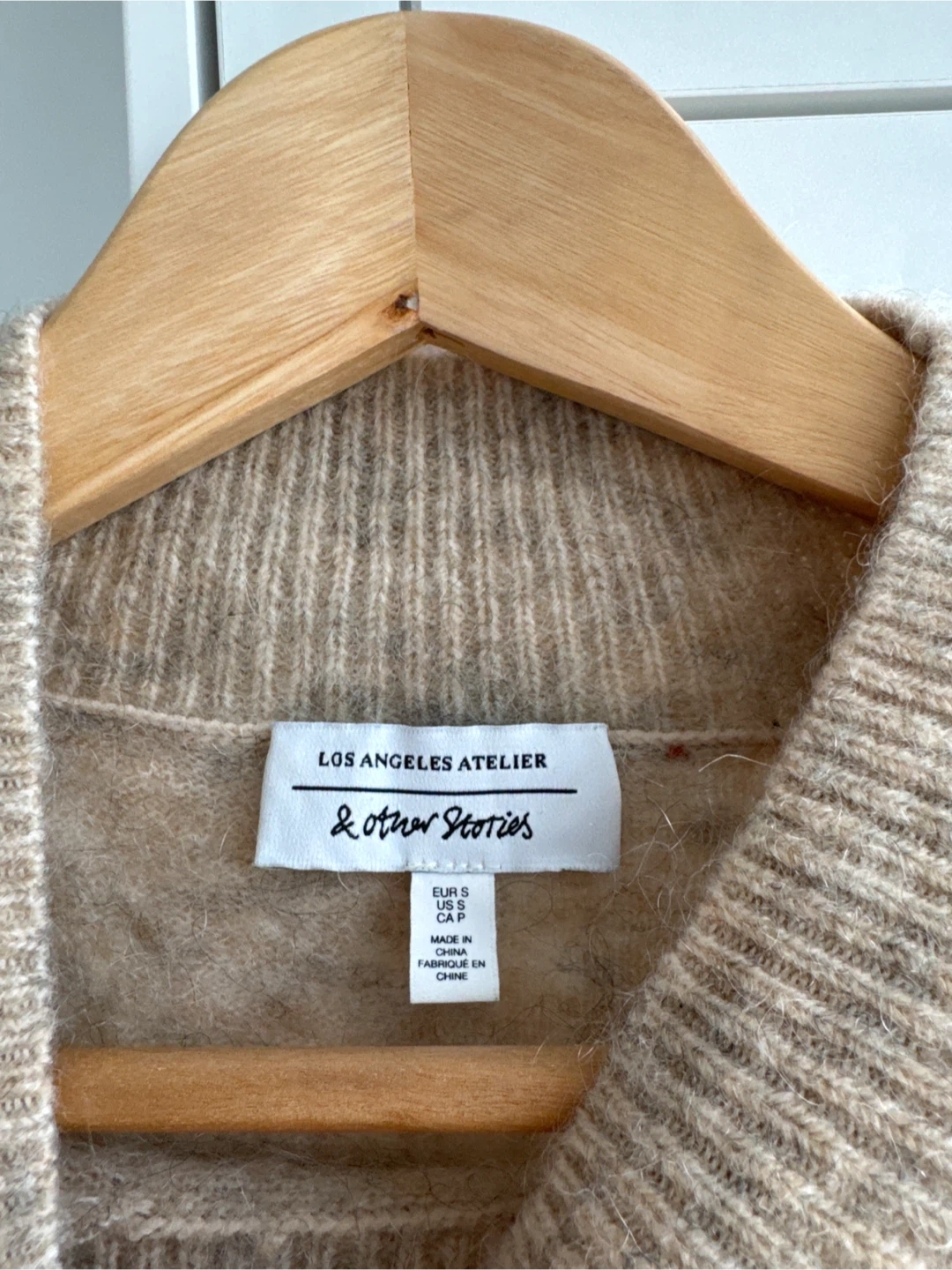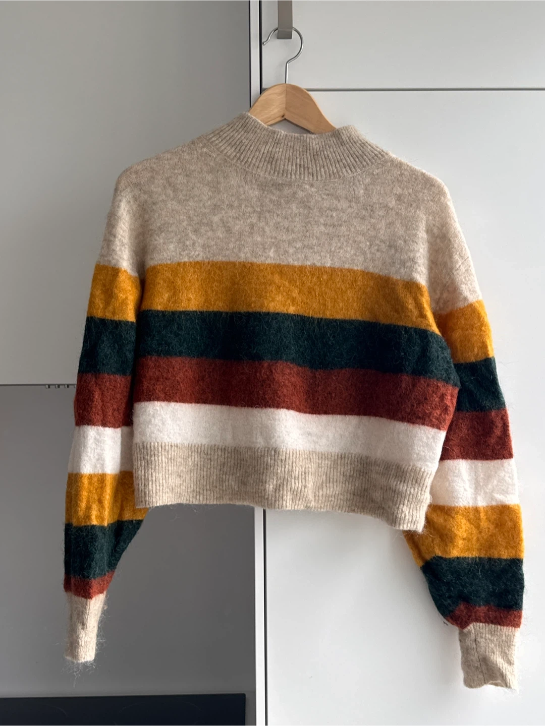 Cozy & Other Stories sweater in a size small. It has a lovely striped pattern with colours like beige, mustard yellow, brown, green and white. I