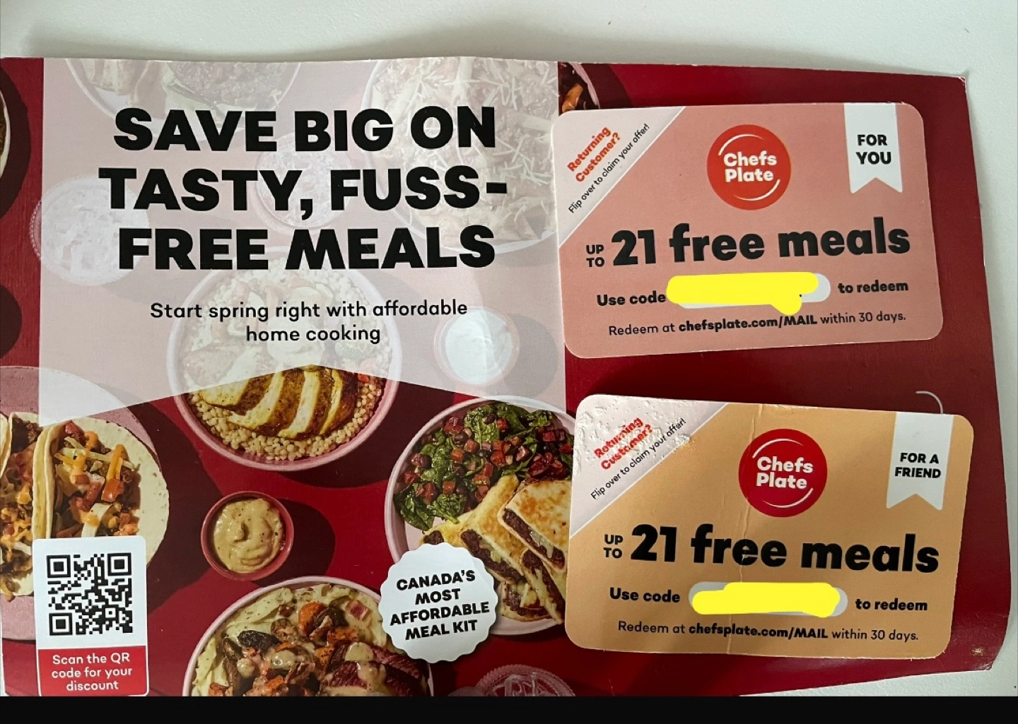 I have a voucher for Chef's Plate that gives you up to 21 free meals! It's a great opportunity to try out their meal kits and save on home cooking. Redeem the code at chefsplate.com/MAIL within 30 days to claim your meals