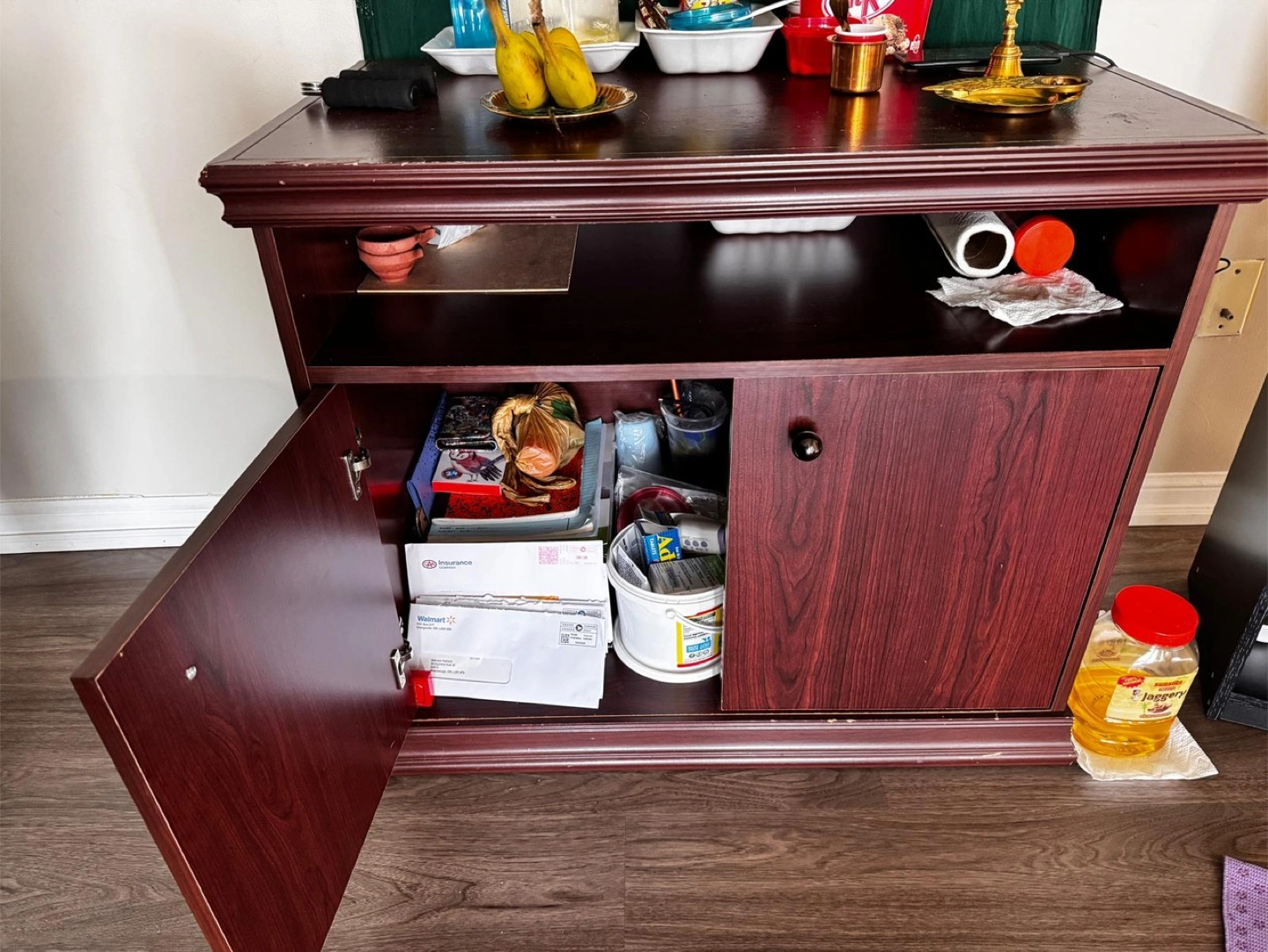 14Selling a dark wood cabinet. It has one door and an open shelf on top. Great for storage!