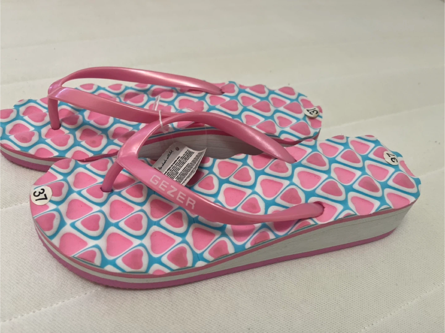 192Cute brand new Gezer flip flops in a fun pink and blue heart pattern! They're size 37 and ready for summer!