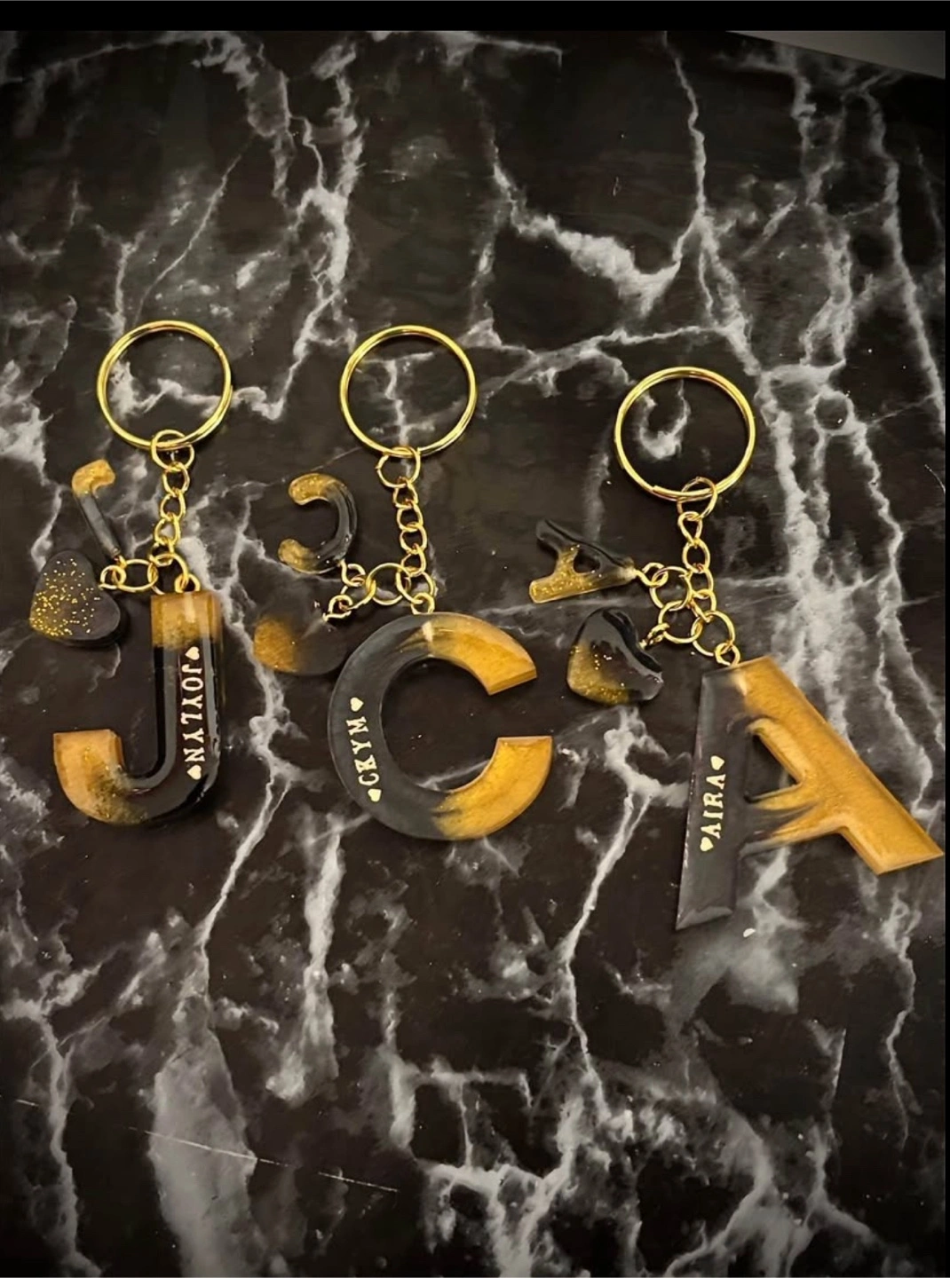 Check out these super cute custom initial resin keychains! Each one is handmade with a unique black and gold swirl design. They're perfect for adding a personal touch to your keys or backpack