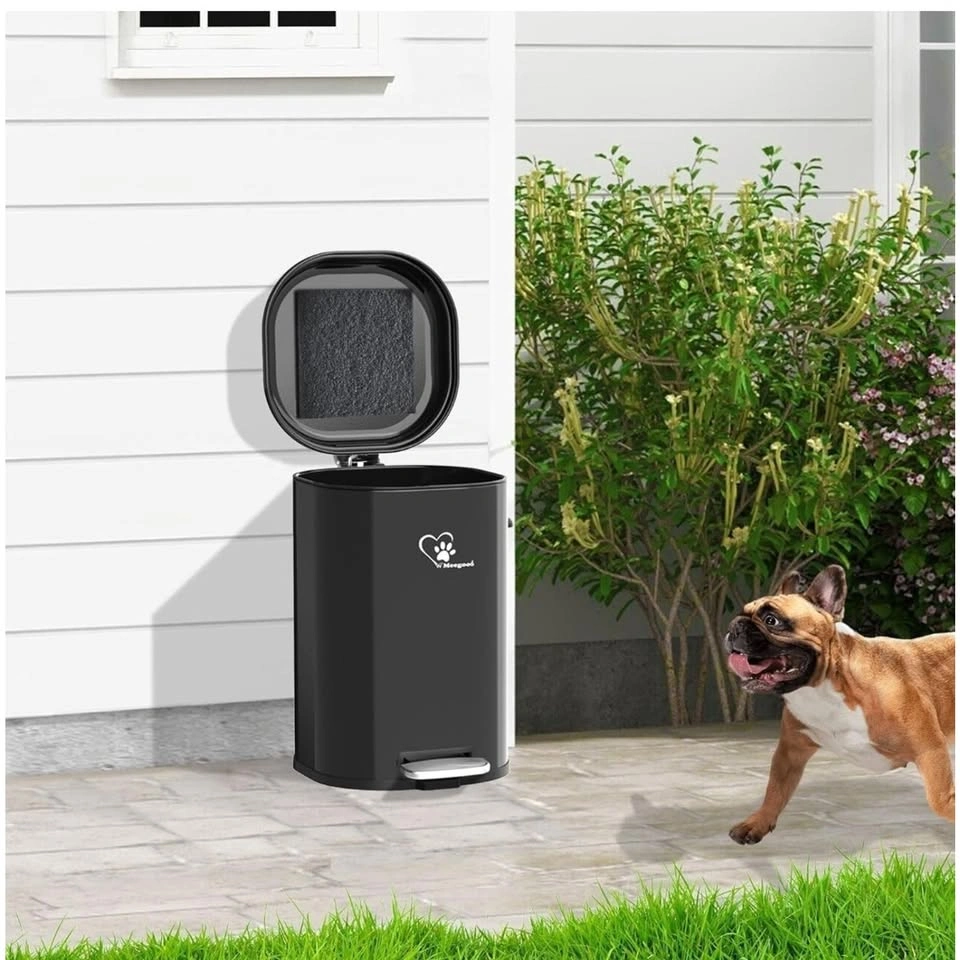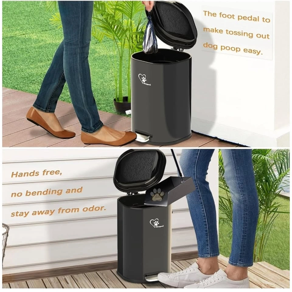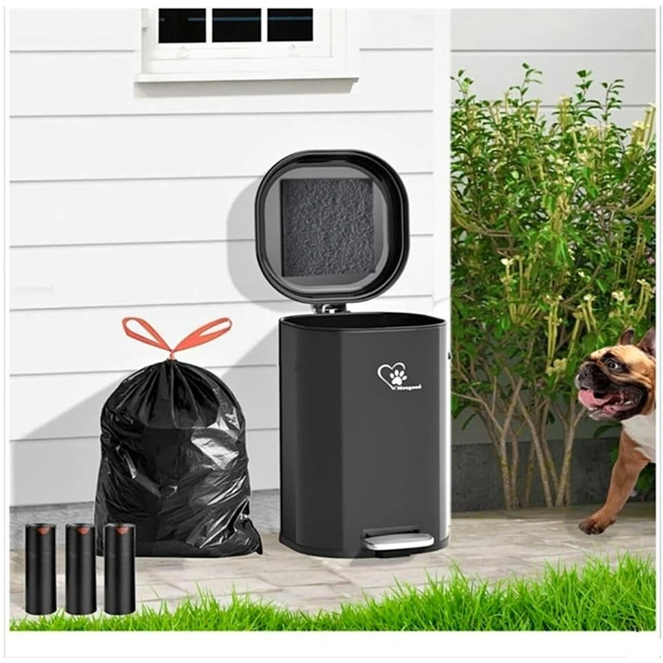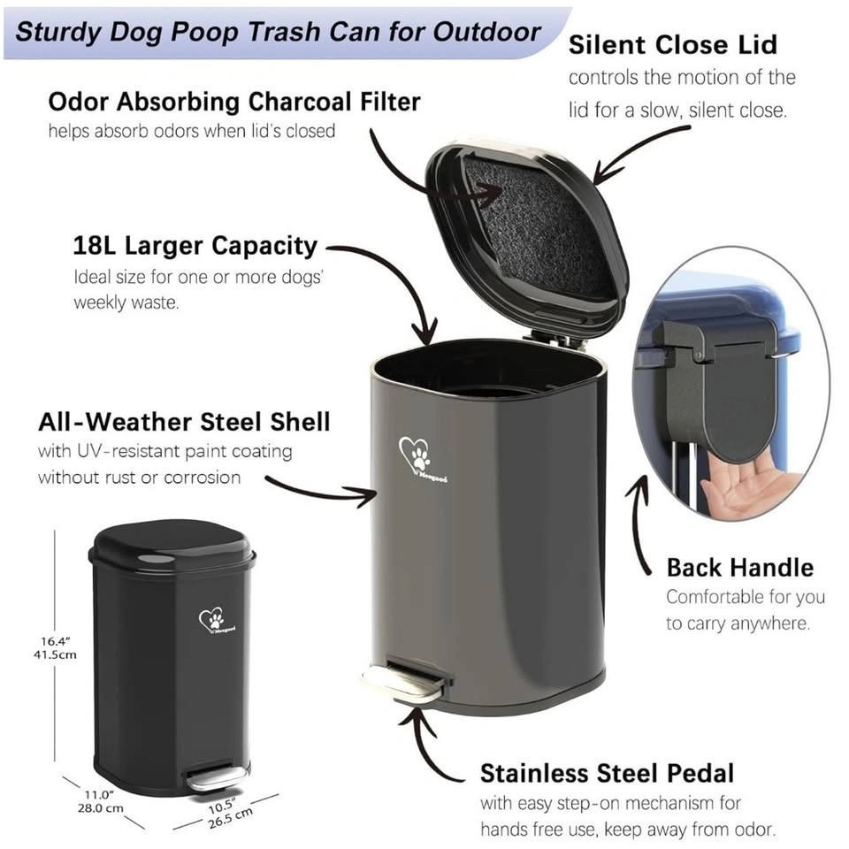 6018L/4.76Gal large capacity, perfect for one or more dogs' weekly waste. Heavy-duty dog waste trash can to store and dispose of pet waste. A removable inner bucket with a carrying handle makes trash disposal simple, and a handy bag retention ring ensures no spills. Free 45-piece waste bags included. Features an activated charcoal filter to absorb and capture odors. Environmental friendly, tear-resistant and safe to use. Ideal for capturing carbon-based impurities or organic chemicals, keeping your home clean and fresh. Suitable for indoor or outdoor spaces, such as a kitchen, living room, bathroom, or backyard. Can also be used for cat litter box waste, household waste, office waste, kitchen waste, and so on. Features a cushioning mechanism that slows down the closing of the lid. Just gently press the pedal and the lid opens and closes smoothly and noiselessly. Includes a custom-designed assembled high-capacity trash can, a removable inner container, an odor-control filter, and 45 waste bags. Features stainless steel construction with UV protection.