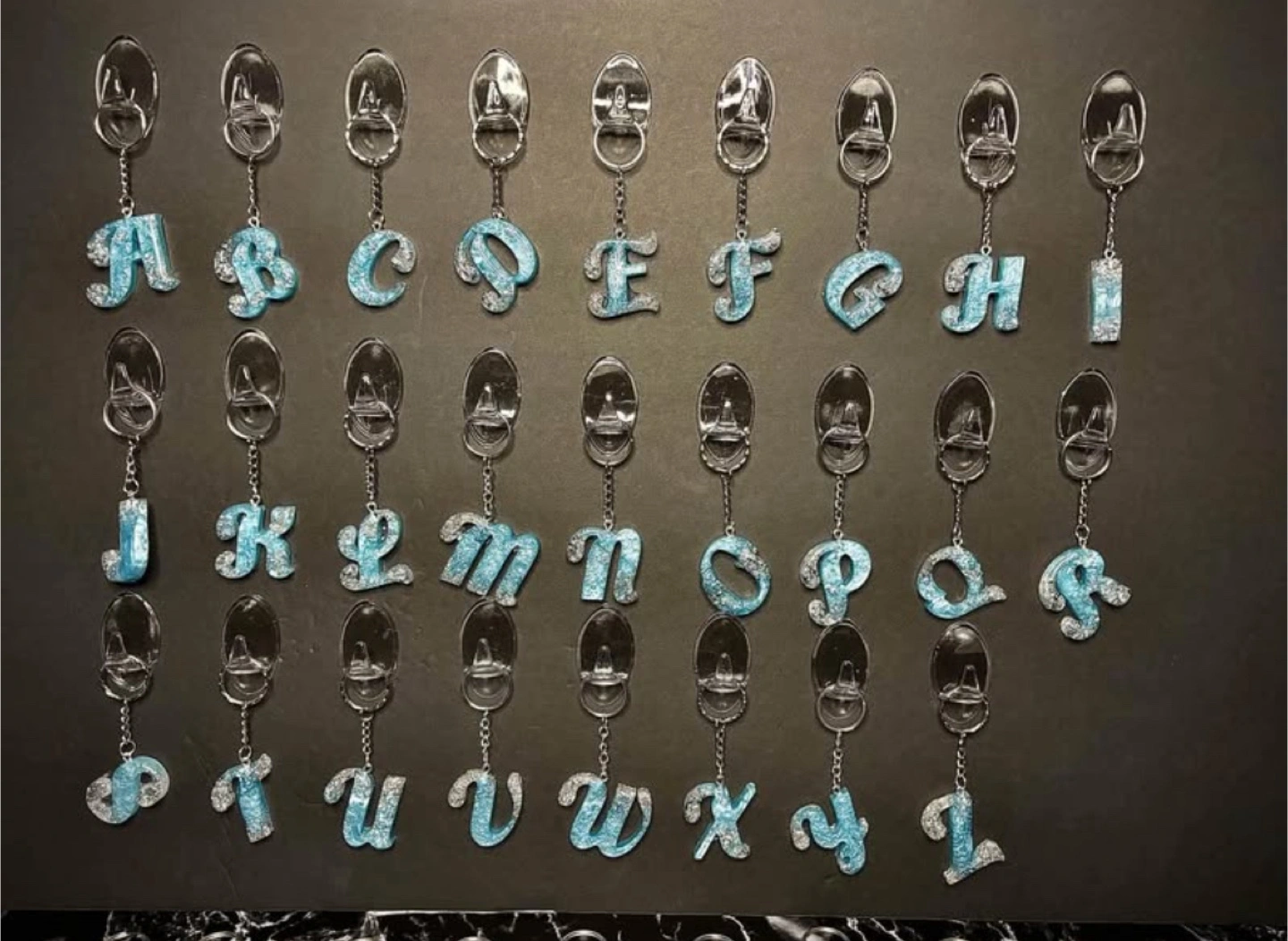 I have a collection of alphabet resin keychains! They are light blue with glitter. Choose the letter you want from A to Z. Perfect for adding a personal touch to your keys or bags