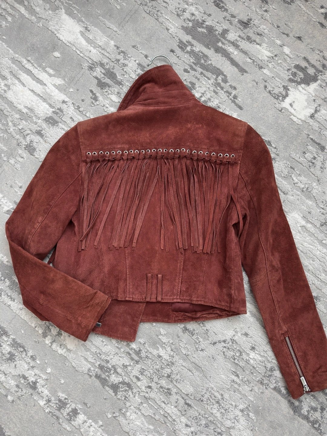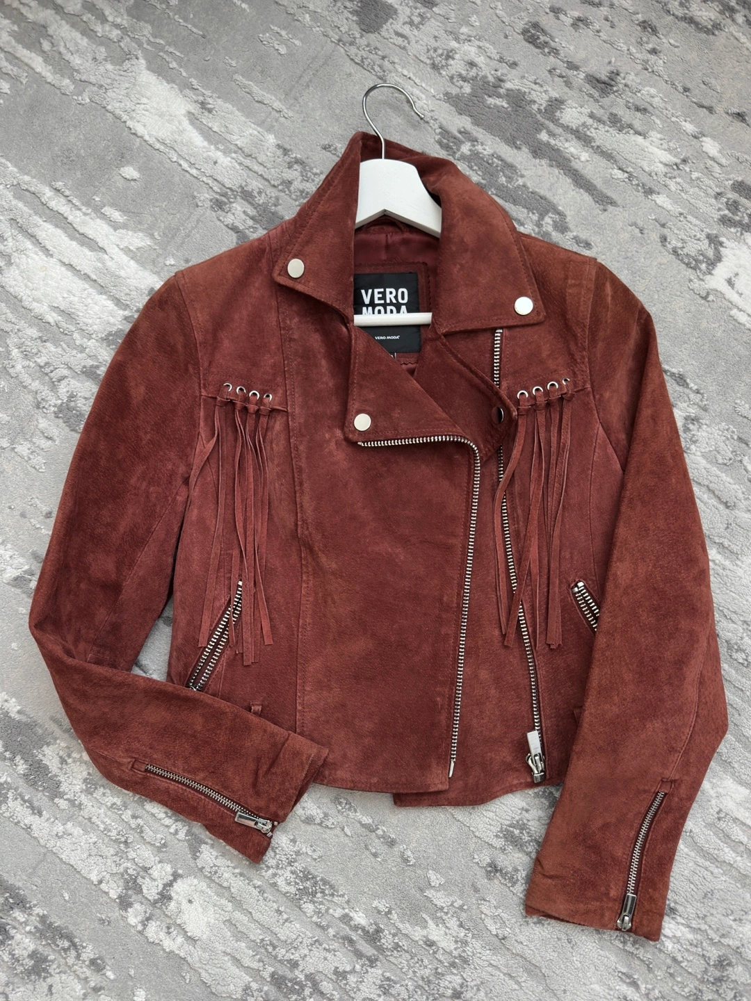 Selling a stylish Vero Moda biker jacket! It's a gorgeous suede material in a trendy rust-brown colour. The jacket features fun fringe detailing on the front and back. size 160/80A, barely worn. No belt. Sold as is