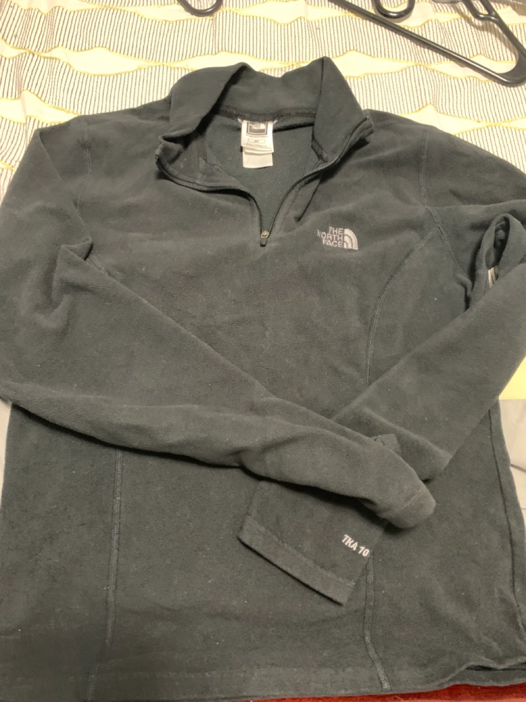 Selling a cozy The North Face fleece pullover in women's size small! It's a great layering piece for cooler weather or just lounging around. The material is soft and comfortable. The colour is a versatile black that goes with everything