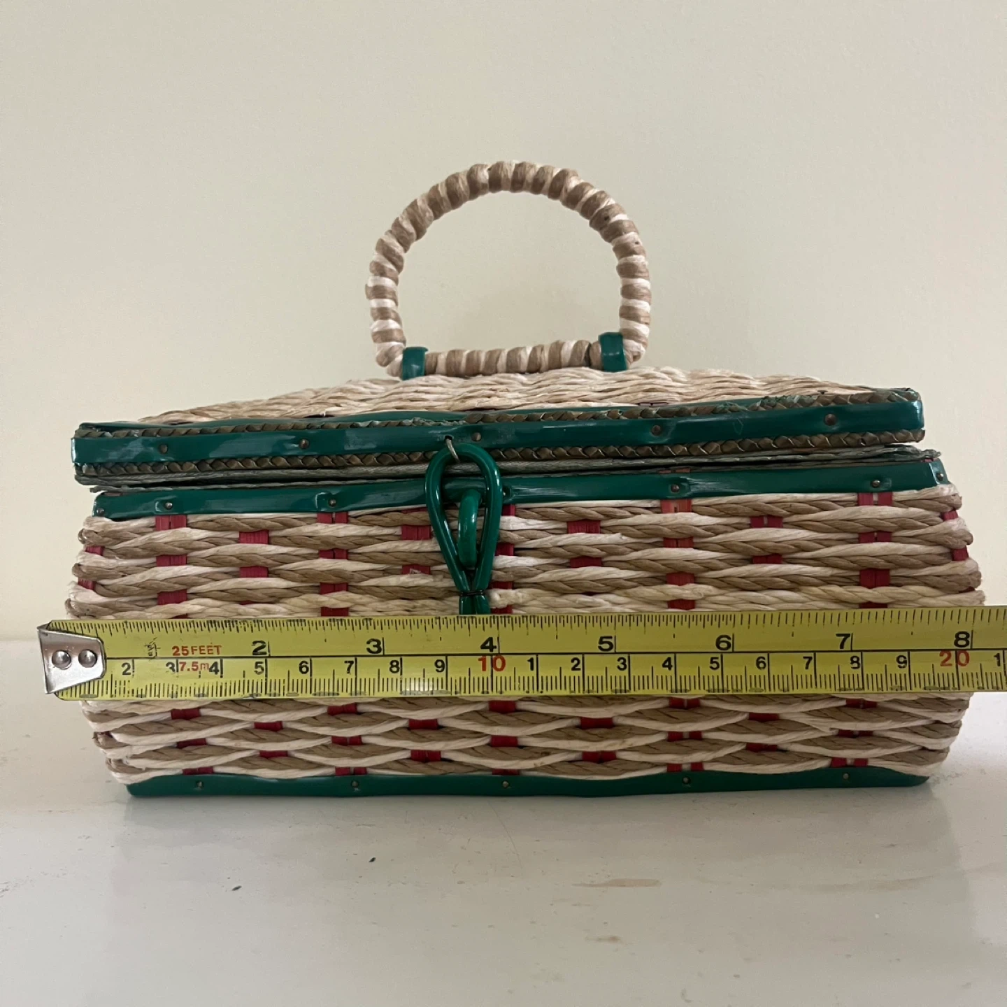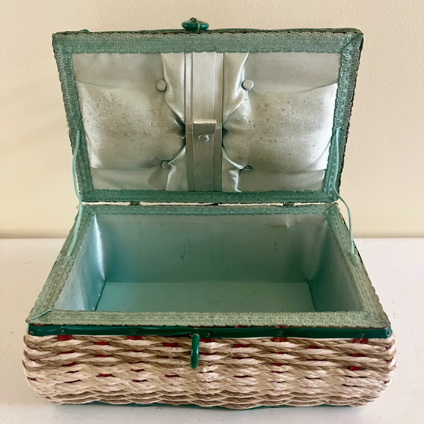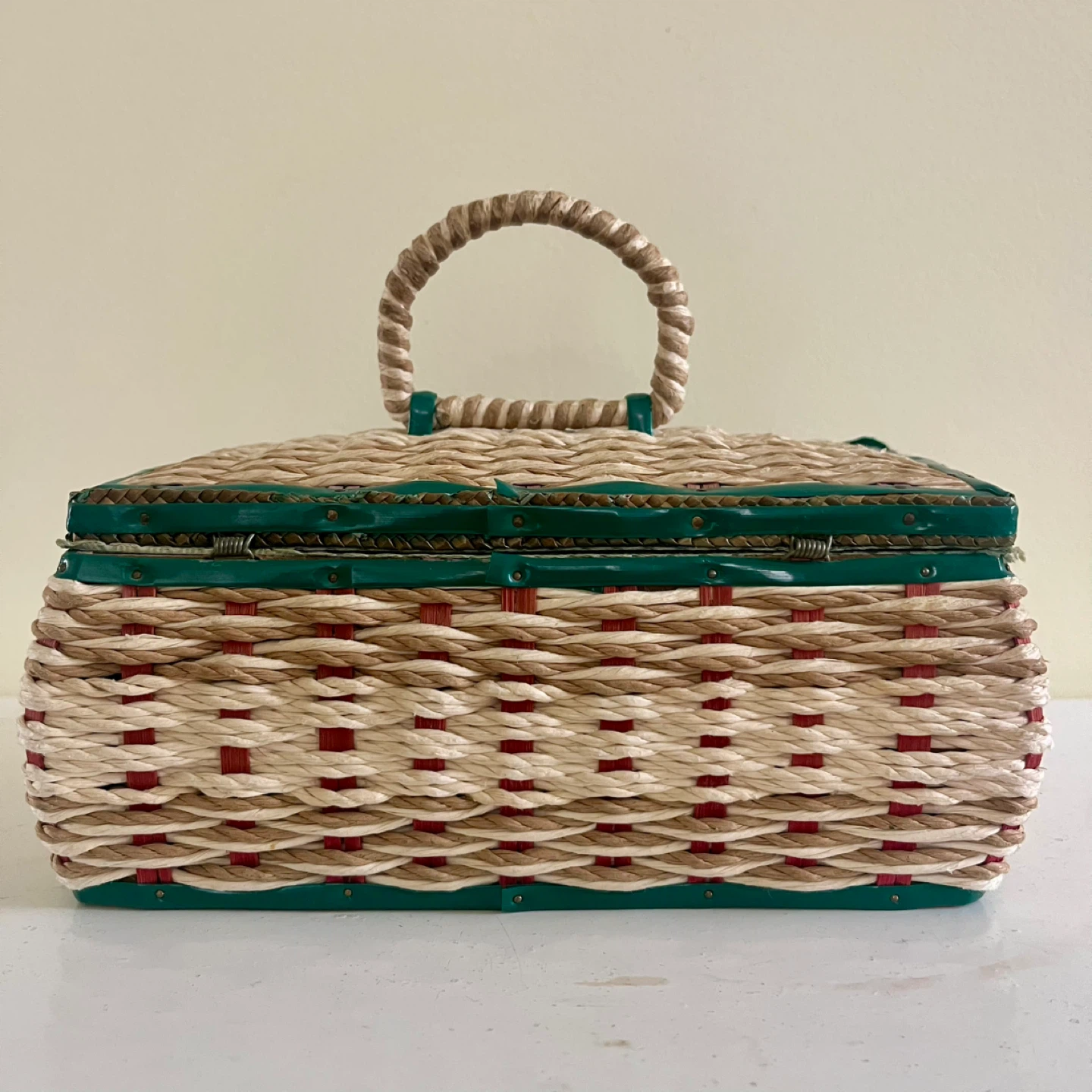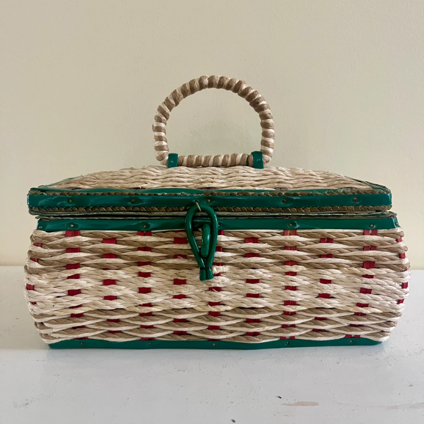 This vintage sewing basket, made in Japan, is a charming and functional piece for any sewing enthusiast. The basket features a woven design with green and red accents, a sturdy handle, and a lift-up latch closure. The interior is lined with a light green satin. Good vintage condition.