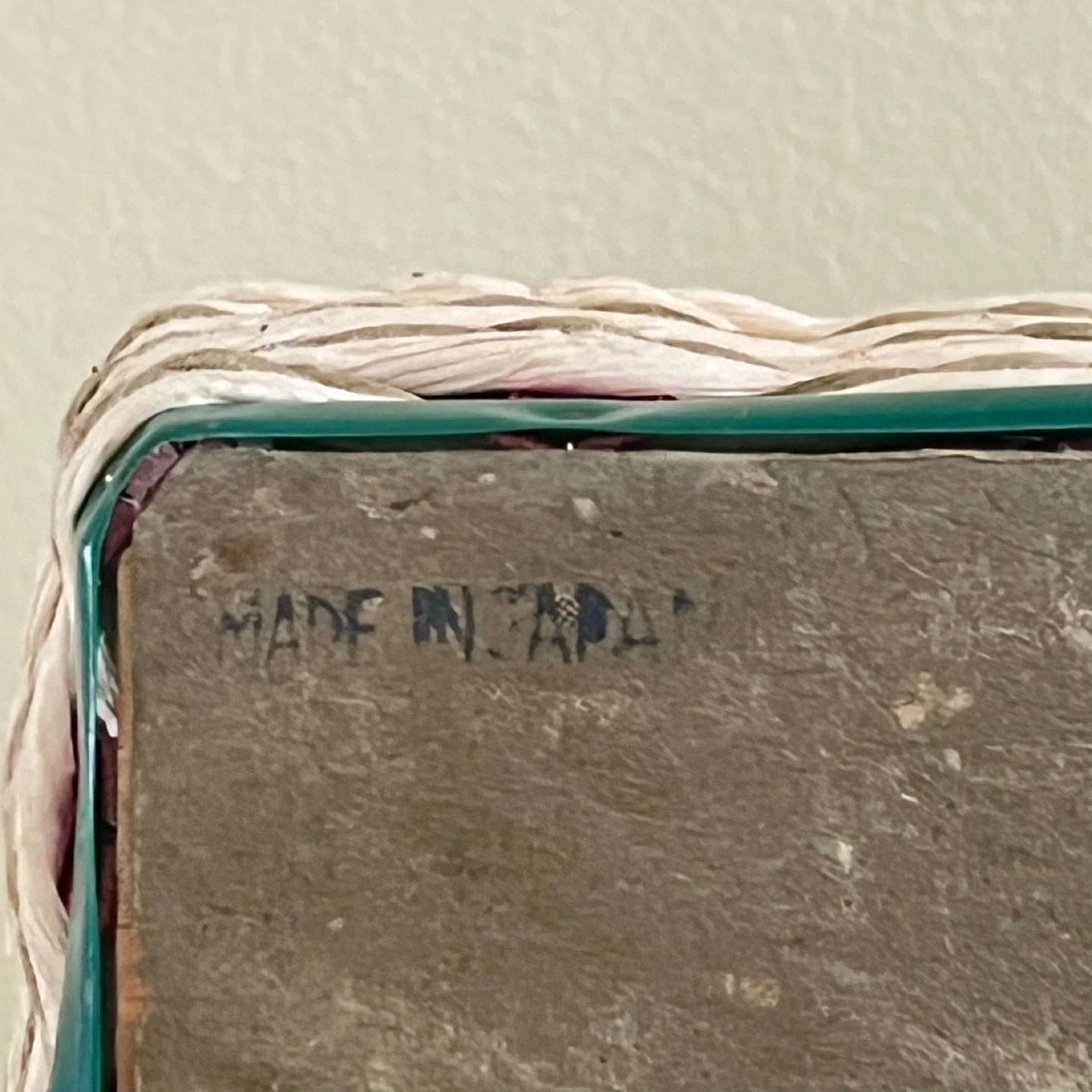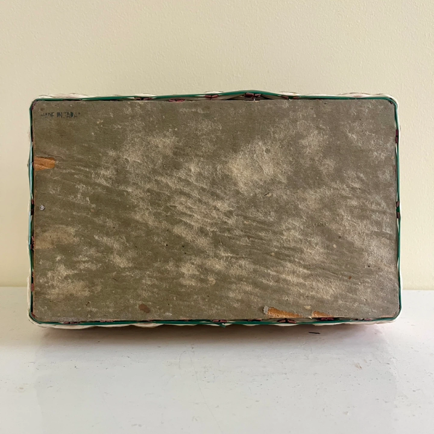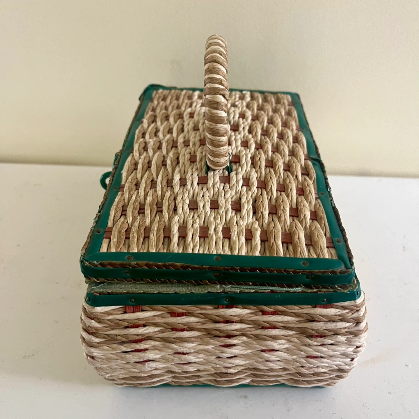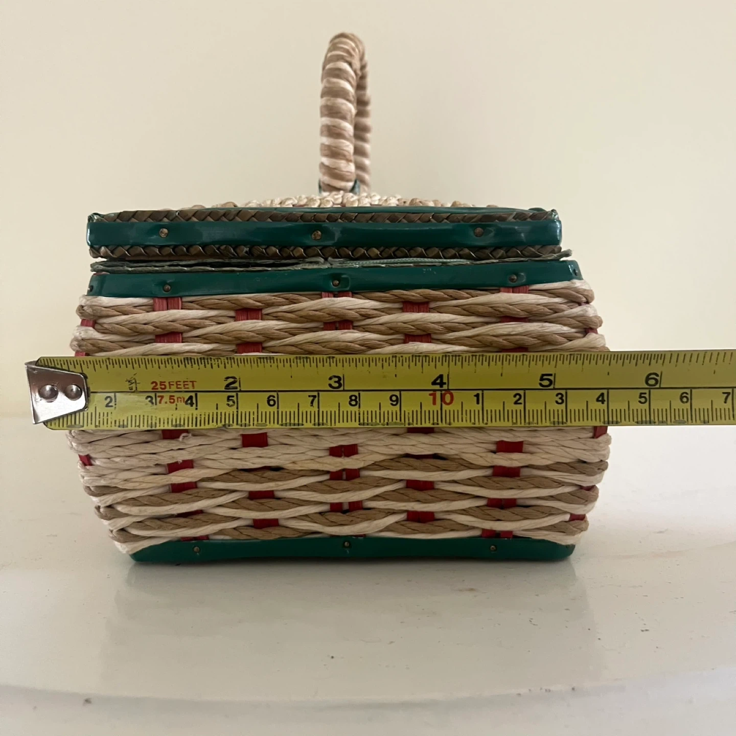 This vintage sewing basket, made in Japan, is a charming and functional piece for any sewing enthusiast. The basket features a woven design with green and red accents, a sturdy handle, and a lift-up latch closure. The interior is lined with a light green satin. Good vintage condition.