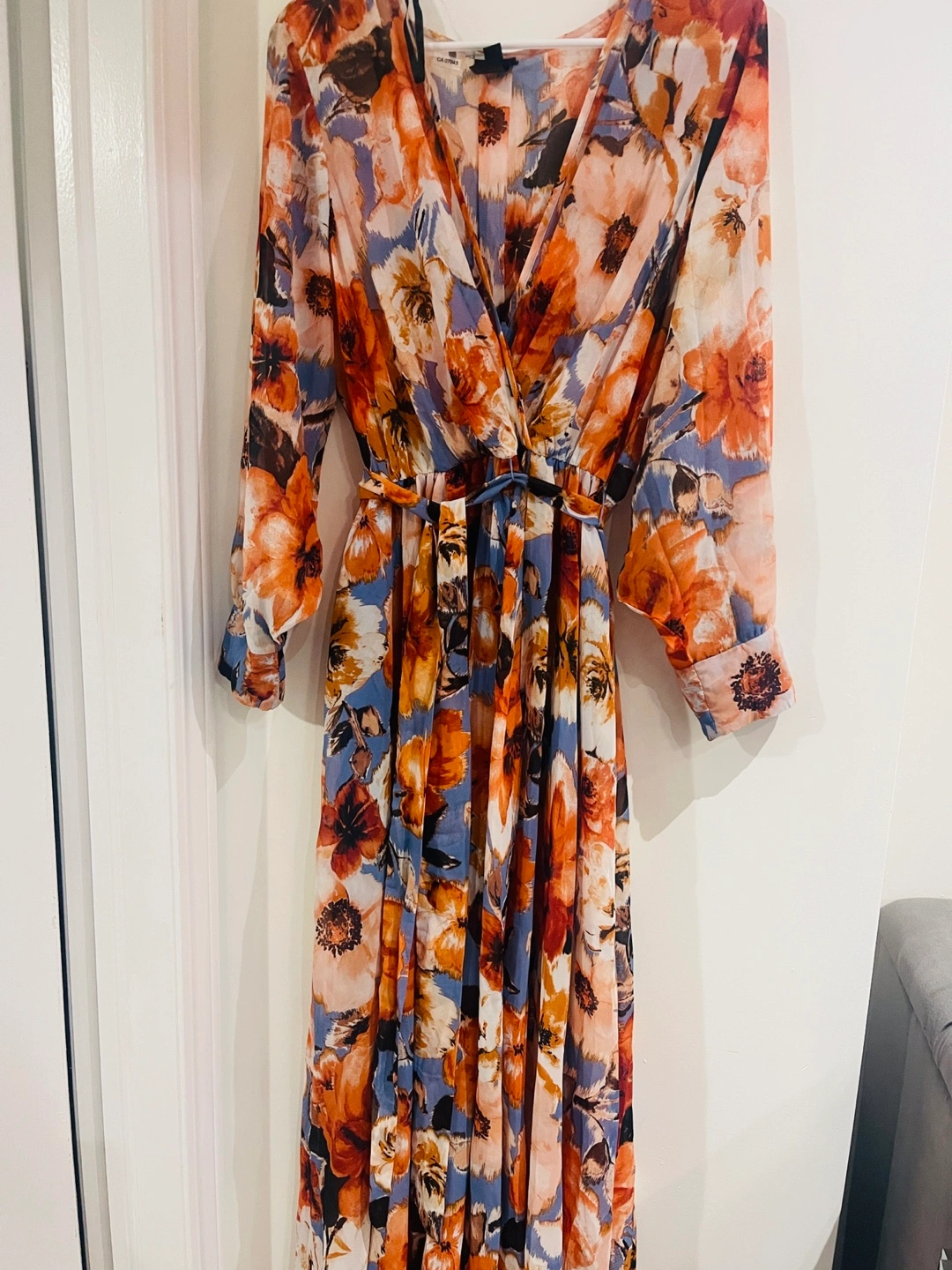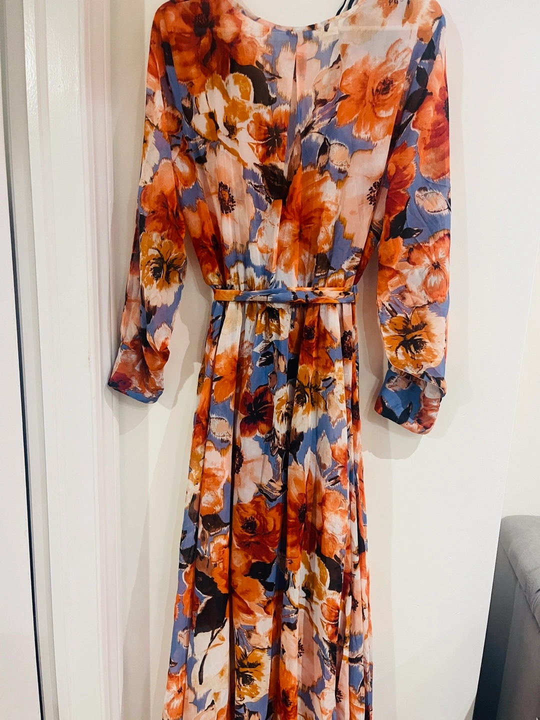 65Beautiful floral maxi dress in a size 14! The dress features a lovely pattern with orange, brown, and blue flowers. Perfect for a summer day or evening out! It's in great condition and ready for a new home