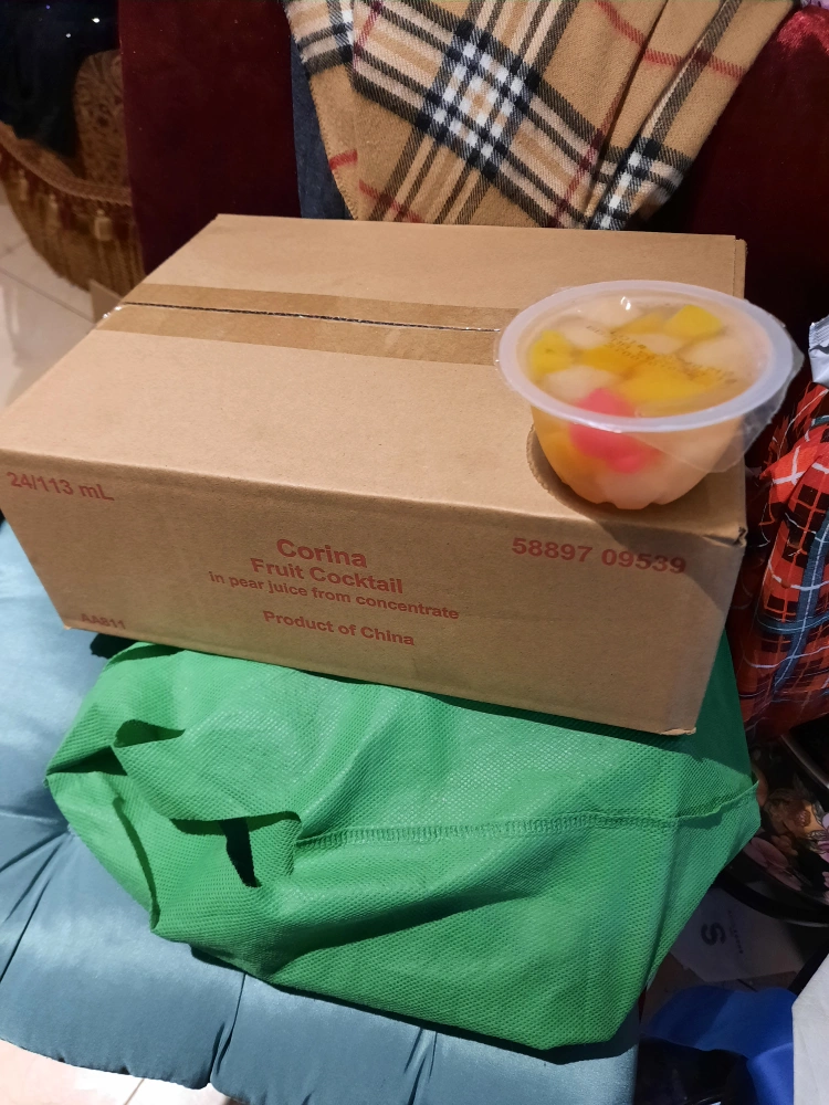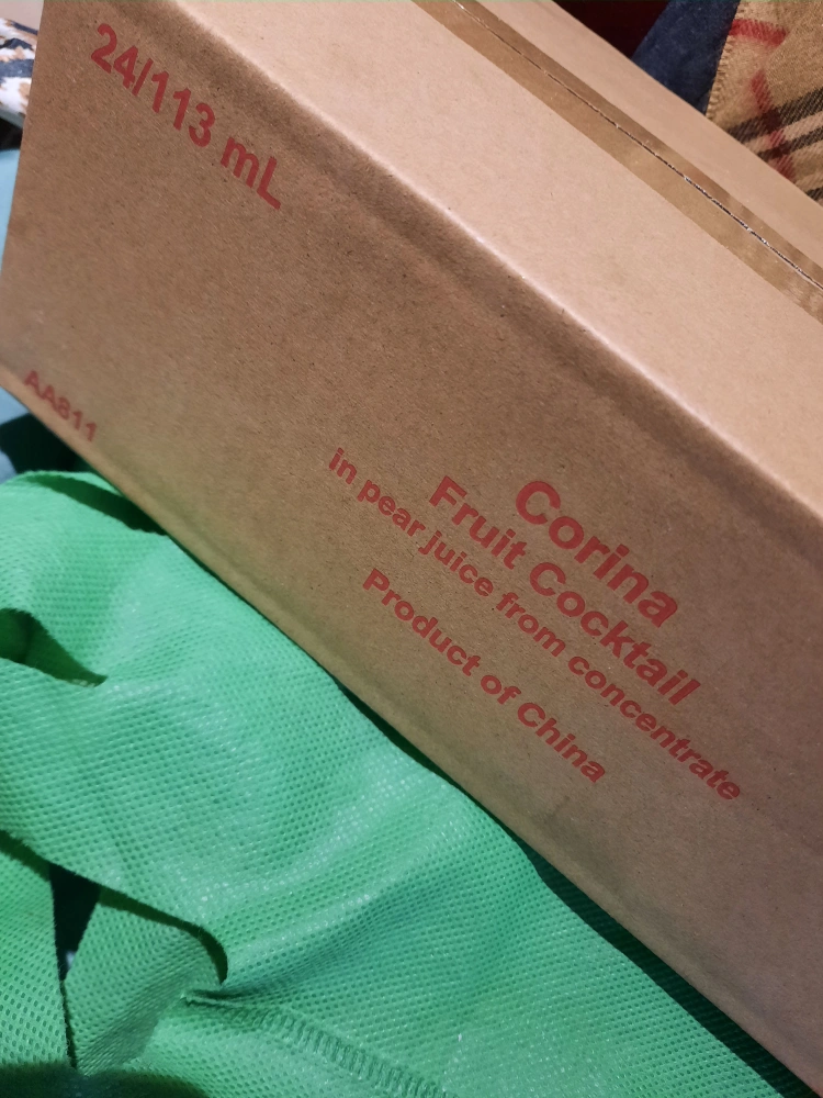 Selling a box of Corina Fruit Cocktail in pear juice from concentrate. Product of China. Each container is 24/113 mL