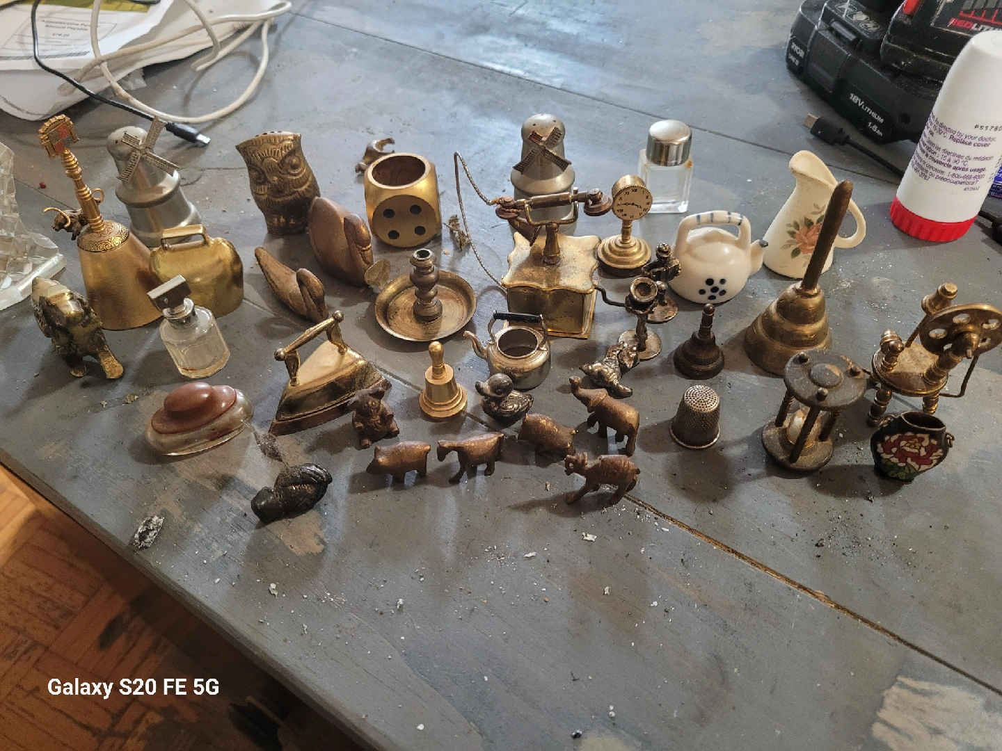 A collection of vintage miniature items! There's a variety of pieces, including bells, animals, furniture, and household items. Great for collectors or anyone who appreciates unique little things..prices very..5$ to 10.$,13$.