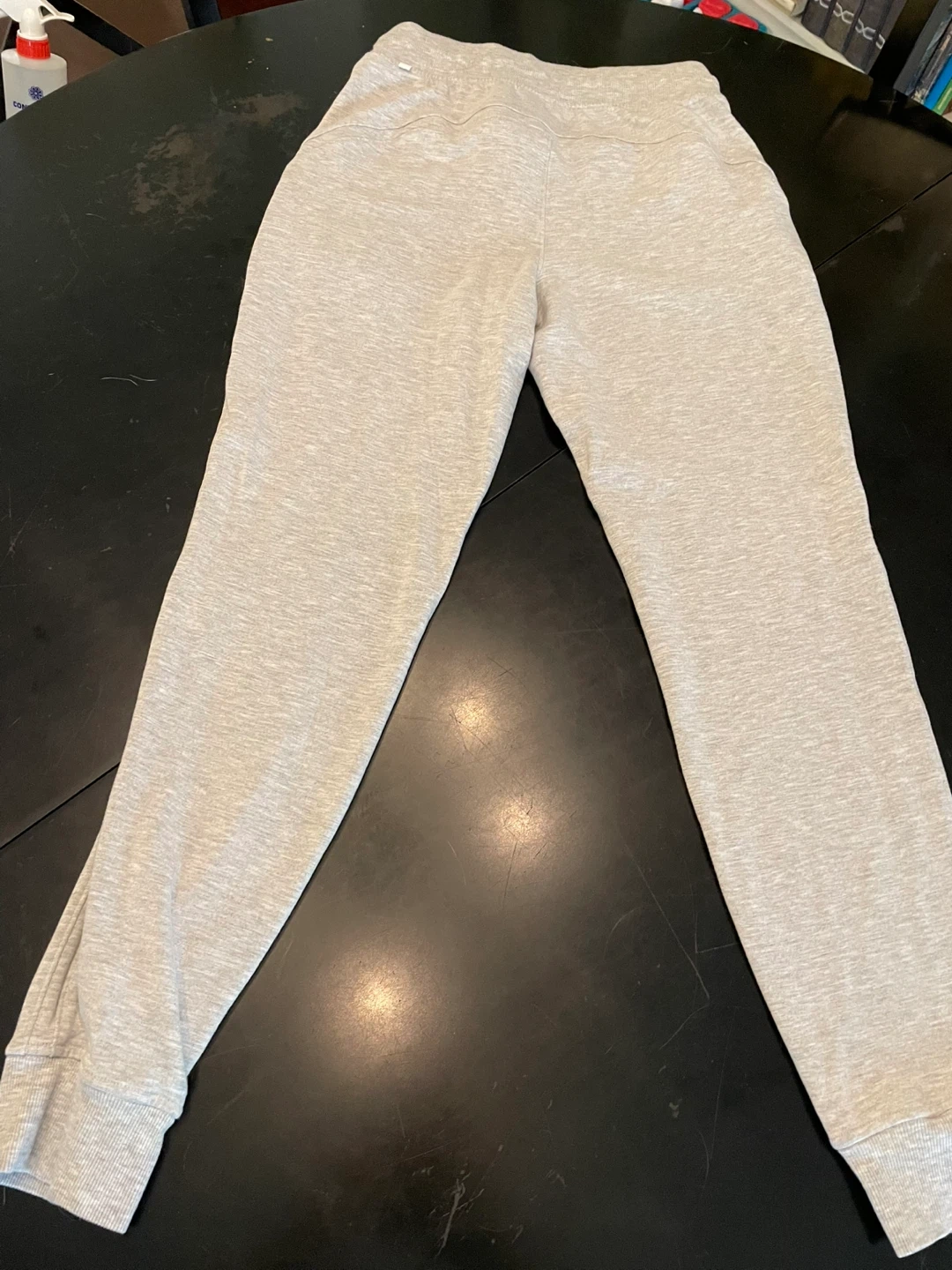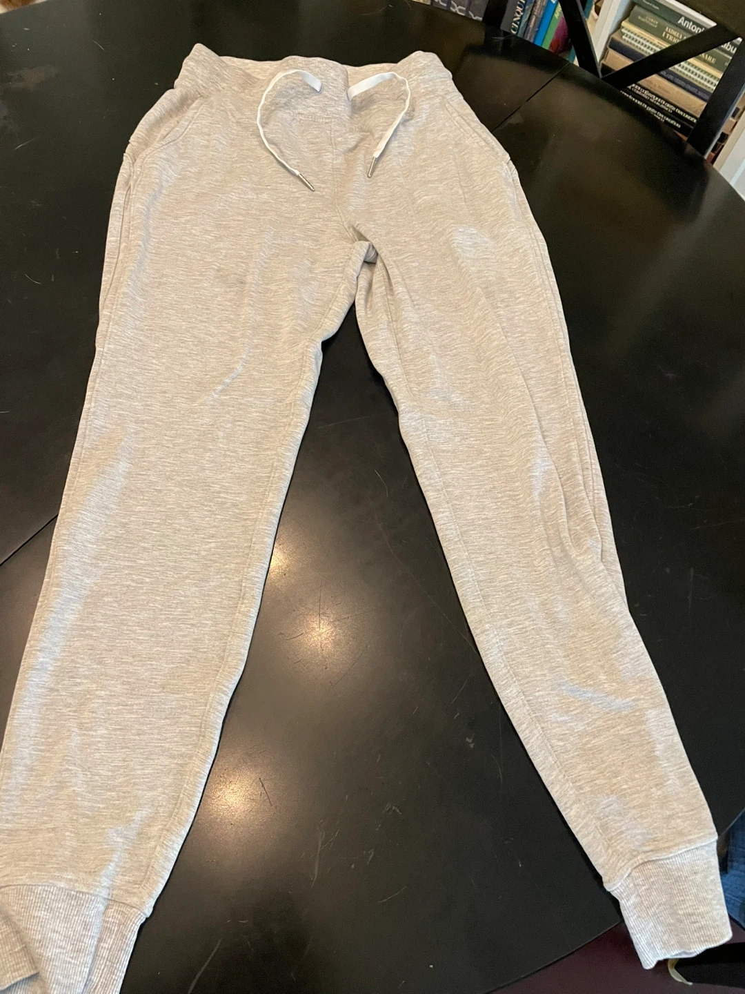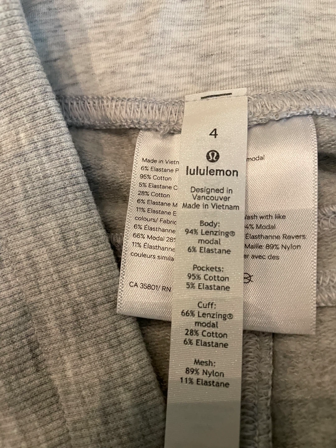 Selling a pair of gently used Lululemon joggers in size 4. They're a light grey colour and made with comfortable materials! The tag shows: