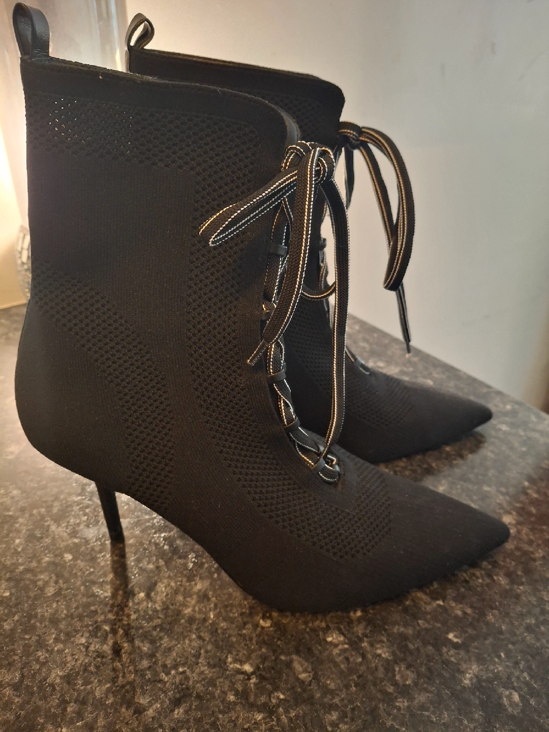 Selling a pair of Zara black heeled booties in size 40. They're in great condition and have a stylish lace-up design. the boot is a stretchy knit and is in perfect shape. size 9.5 or 40.