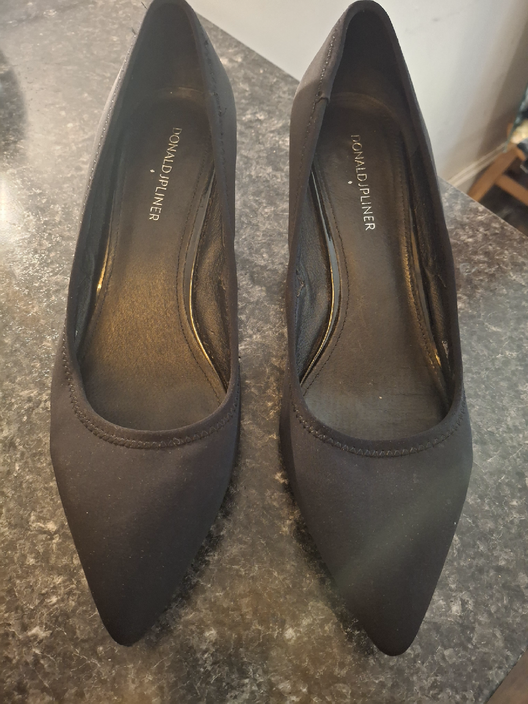 Selling a pair of Donald Pliner black kitten heels in size 9.5. They show some wear on the soles but are still in good condition for everyday wear!