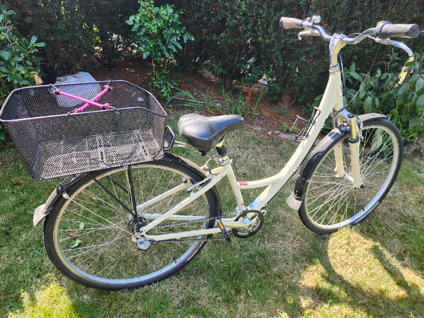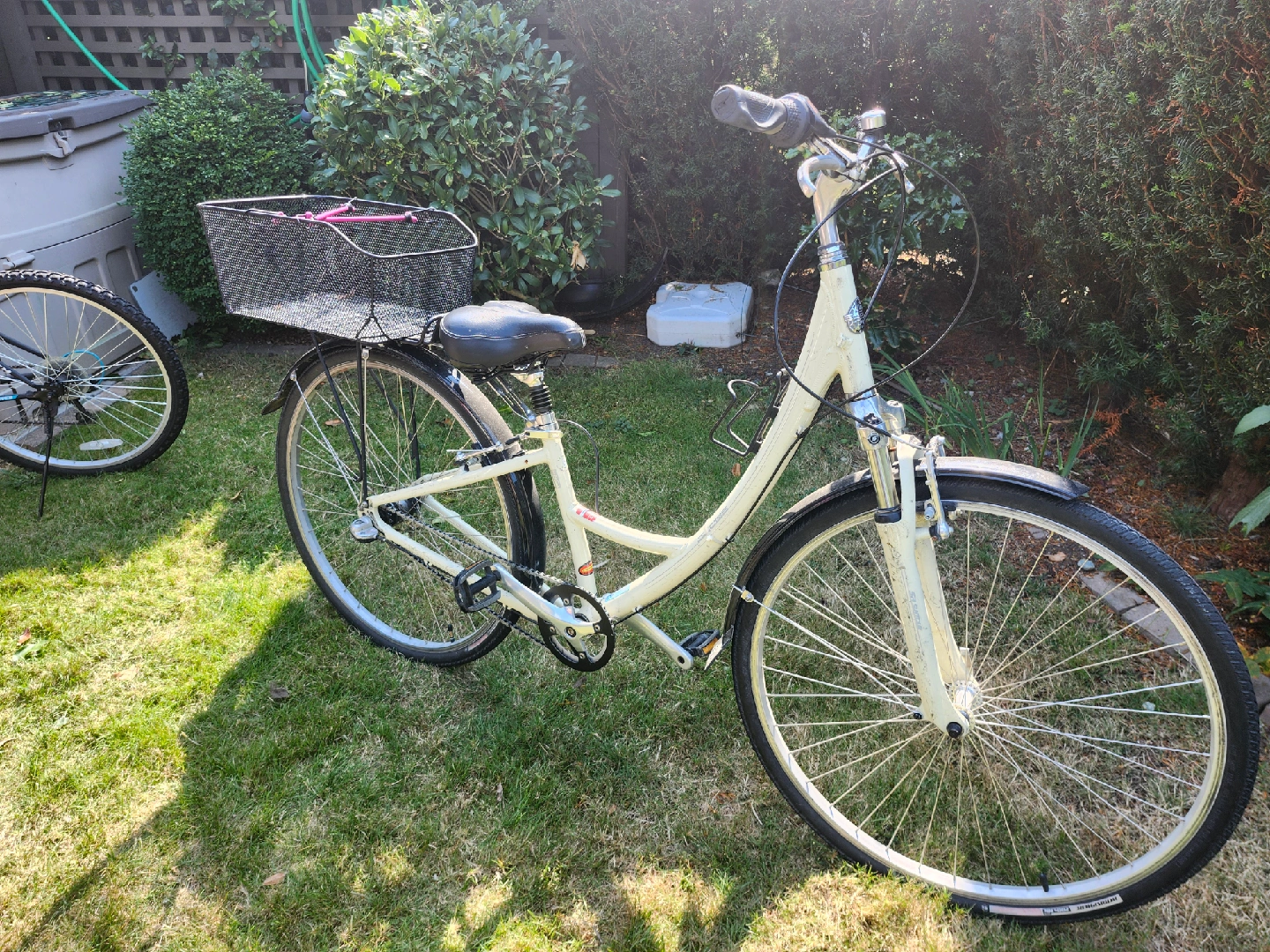 3 speed cruiser with front shock.lowest seat level is 32 inches from the ground. It has a basket in the back, perfect for carrying groceries or other items. Great for cruising around town!