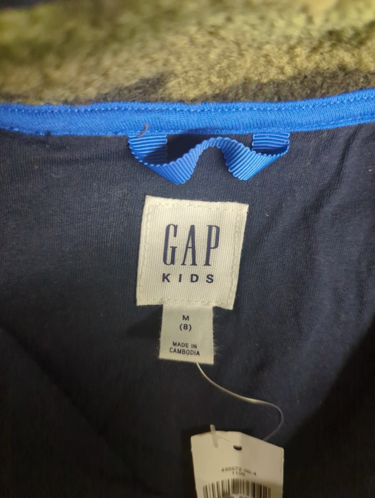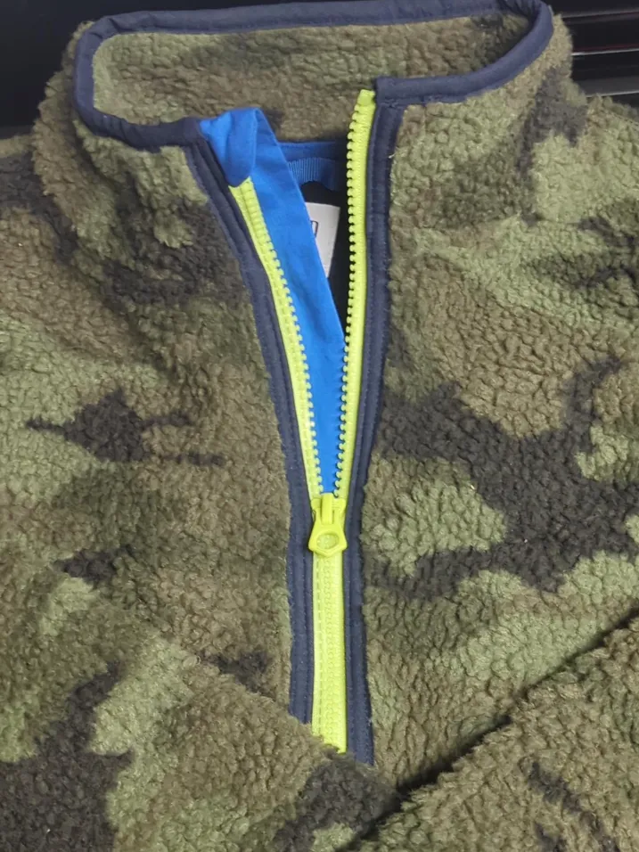 Keep your little one warm with this cozy GAP Kids fleece pullover! It features a cool camo pattern and a bright blue and yellow zipper. The size is M (8). Perfect for layering on chilly days!