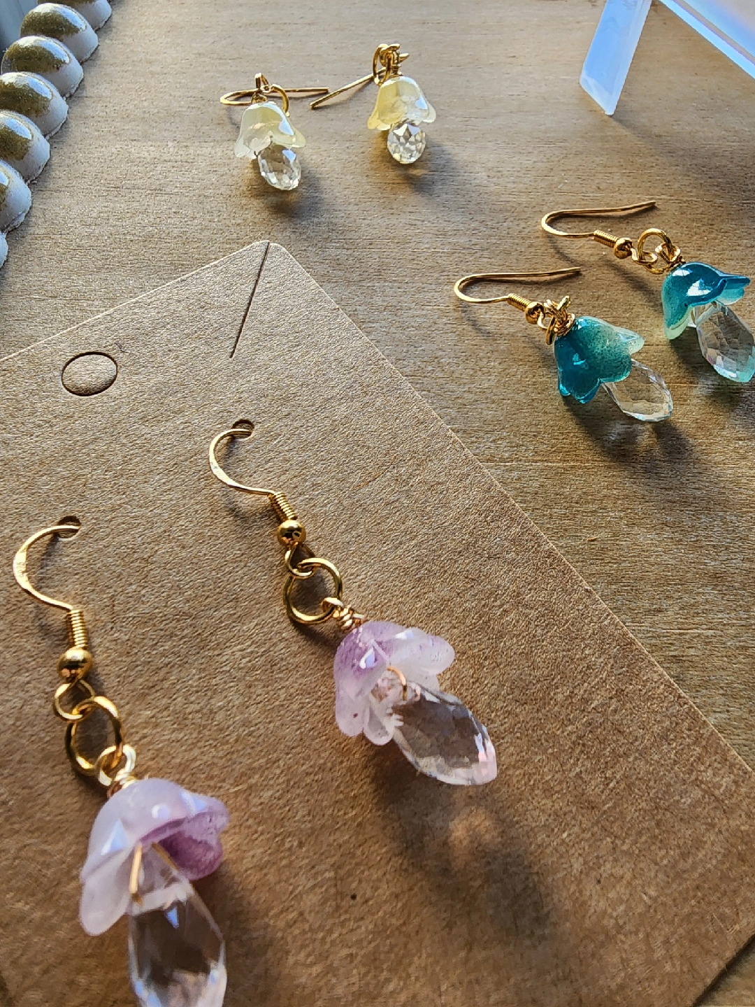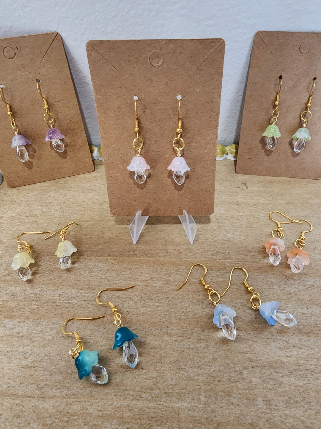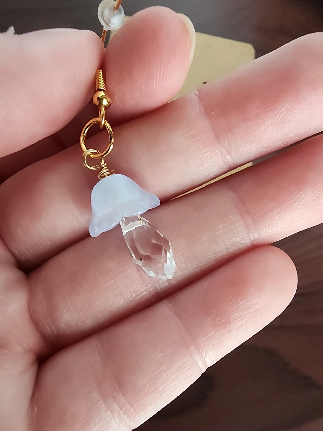 Cute mushroom dangle earrings with gold hooks and clear crystal drops! They're lightweight and perfect for adding a touch of whimsy to any outfit.