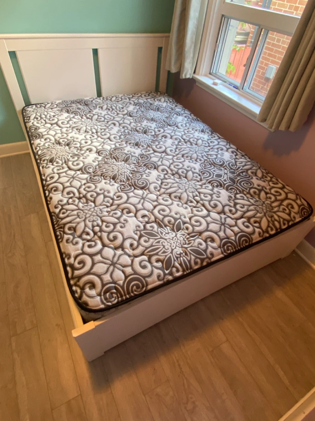 Frame and mattress are in perfect condition. Mattress is only a few months old and has never been slept on. I had it in guest bedroom. Replacing with pull out sofa.