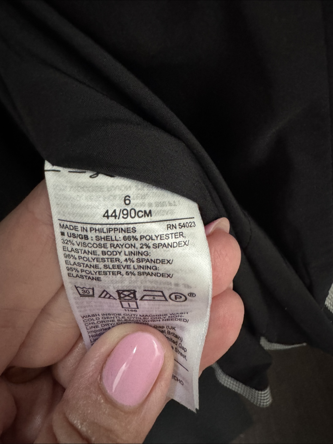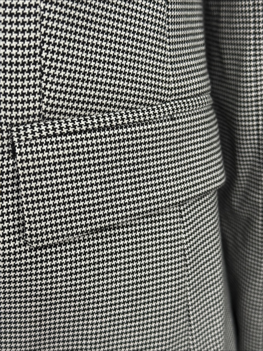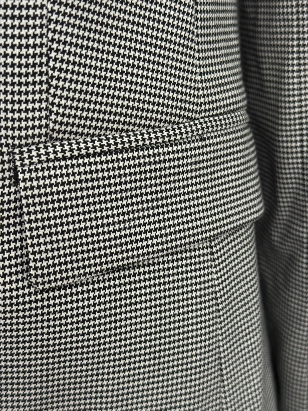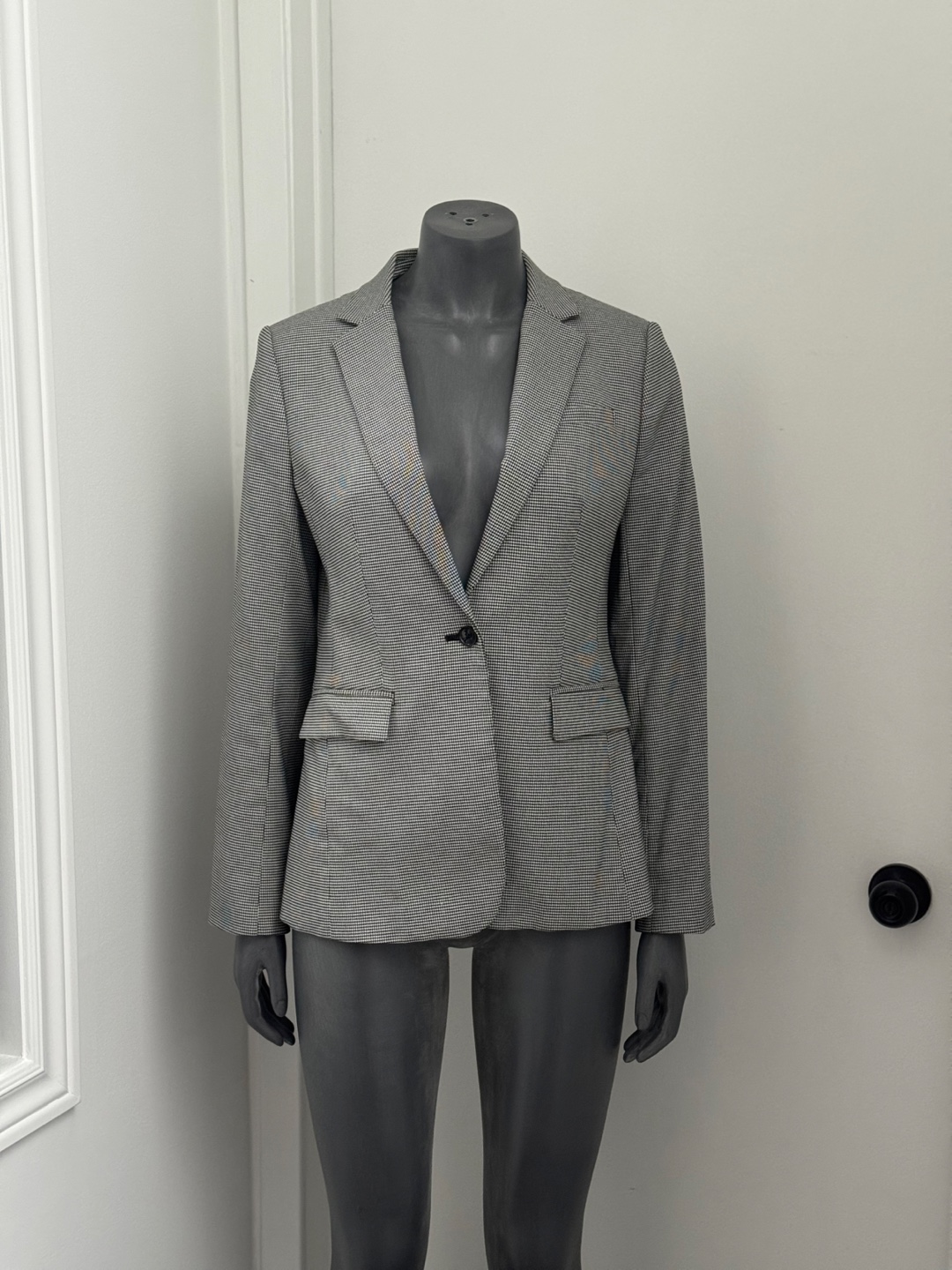 Here's a Banana Republic blazer in a classic houndstooth pattern! It's a size 6 and made with a blend of polyester, viscose rayon, and spandex. Perfect for adding a touch of sophistication to your wardrobe
