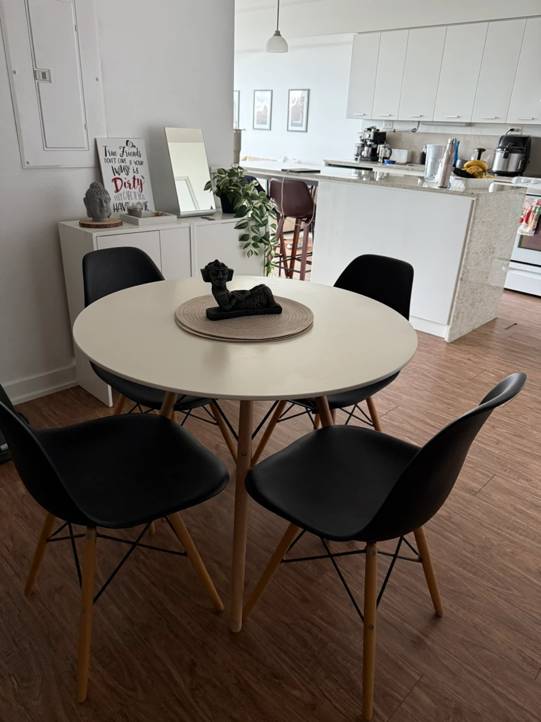 Selling a round dining table with four chairs. It's in great shape and perfect for a small dining area or kitchen nook. The table has a clean, modern look that will fit in with any decor.