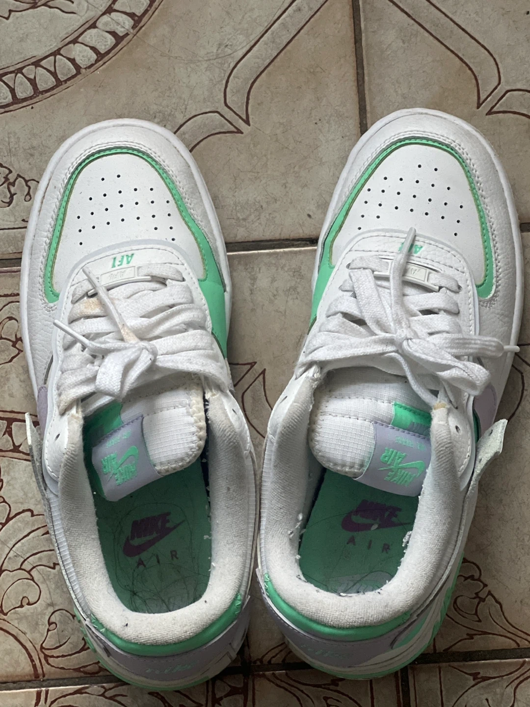 Selling a pair of Nike Air Force 1 sneakers in white with green accents! These are in used condition, as you can see in the photos, but still have lots of life left. Great for everyday wear or hitting the streets in style