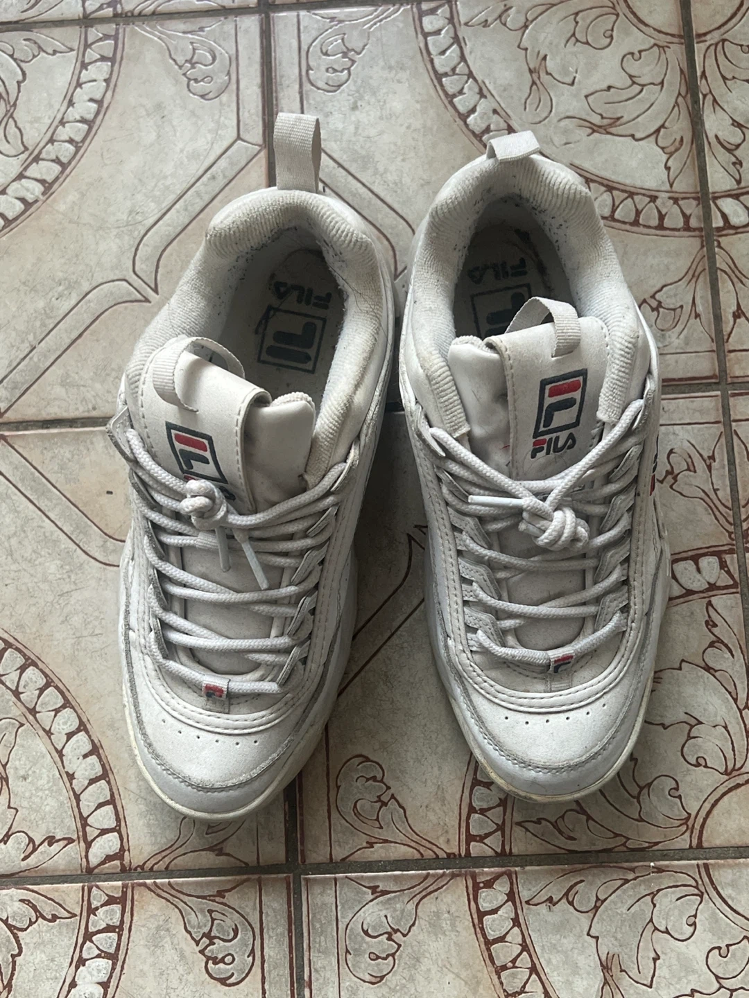 Selling a pair of Fila Disruptor sneakers! They are white and in used condition.