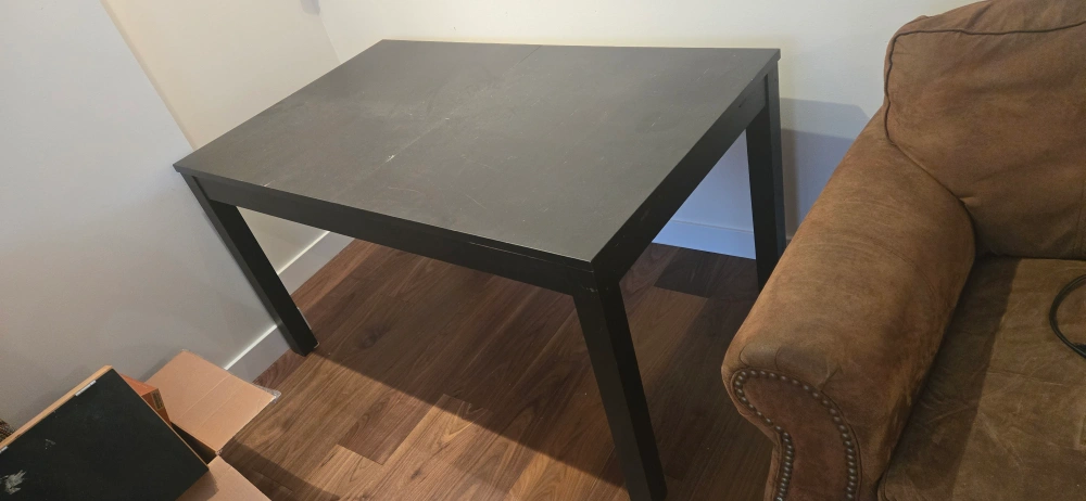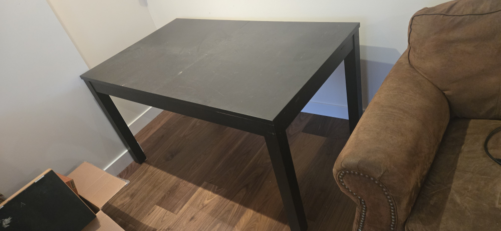 Selling a sturdy black rectangular table. It's in reasonably good condition. It comes with two expansion leafs that can be hidden underneath for when you need an extra long table. see measurements below.