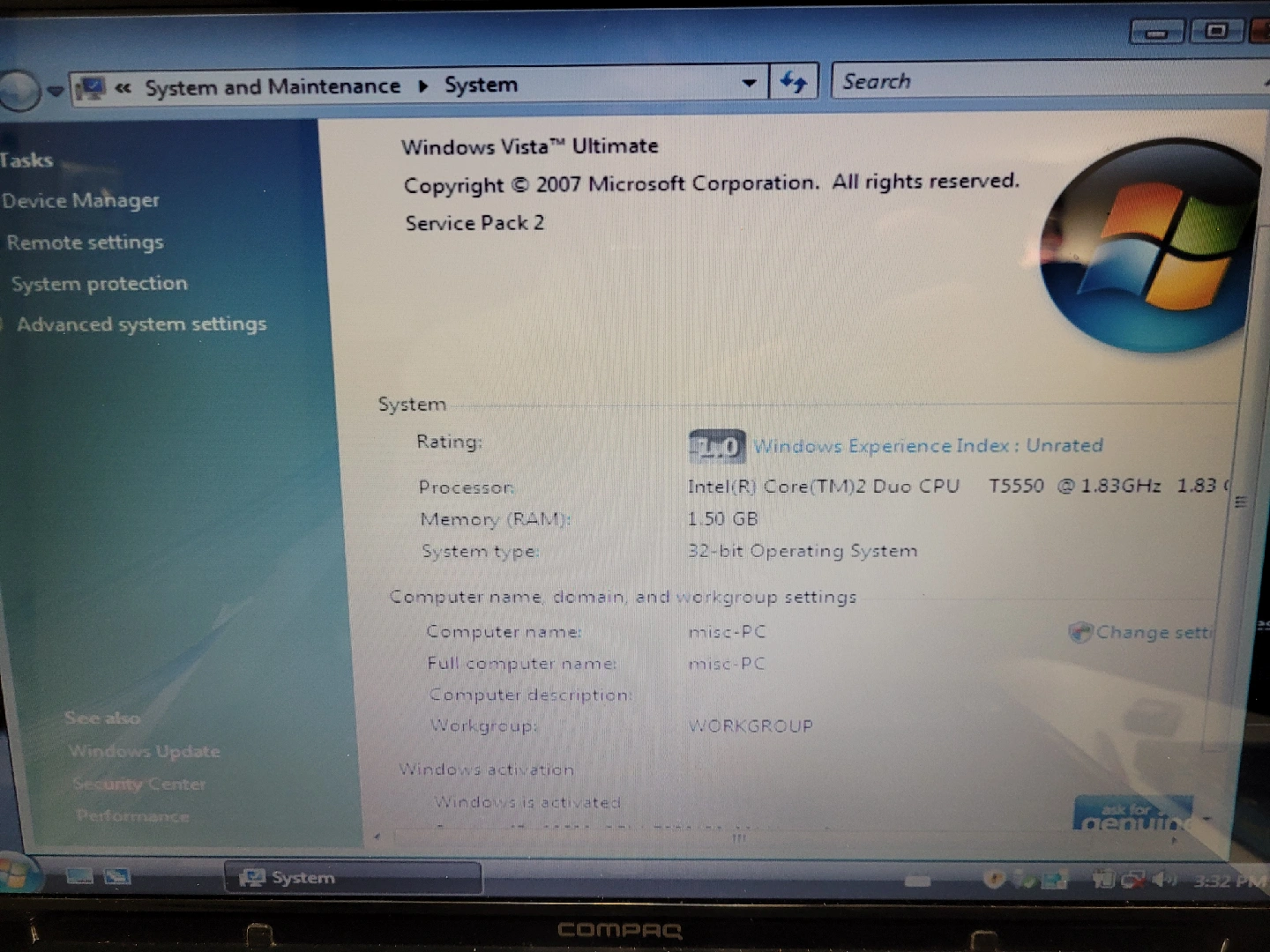 Selling a HP Compaq Presario A900 laptop. It has an Intel(R) Core(TM)2 Duo CPU T5550 @ 1.83GHz and 1.50 GB of memory. It runs on a 32-bit Operating System, Windows Vista Ultimate.