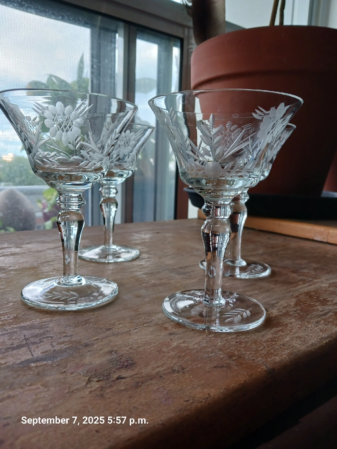 Selling a set of vintage coupe cocktail glasses featuring a delicate etched floral design Perfect for adding a touch of elegance to your home bar or special occasions These glasses are in great condition and ready to be enjoyed