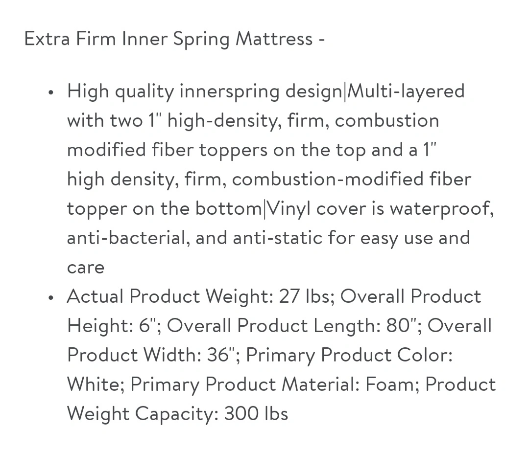 111This is an extra firm inner spring mattress. It features a high-quality innerspring design with multi-layered construction, including 1" high-density, firm, combustion-modified fiber toppers on both the top and bottom. The vinyl cover is waterproof, anti-bacterial, and anti-static for easy care. It weighs 27 lbs, and the dimensions are: 6" in height, 80" in length, and 36" in width. The primary product color is white, and it's made of foam. It has a product weight capacity of 300 lbs. Originally bought for $501.05