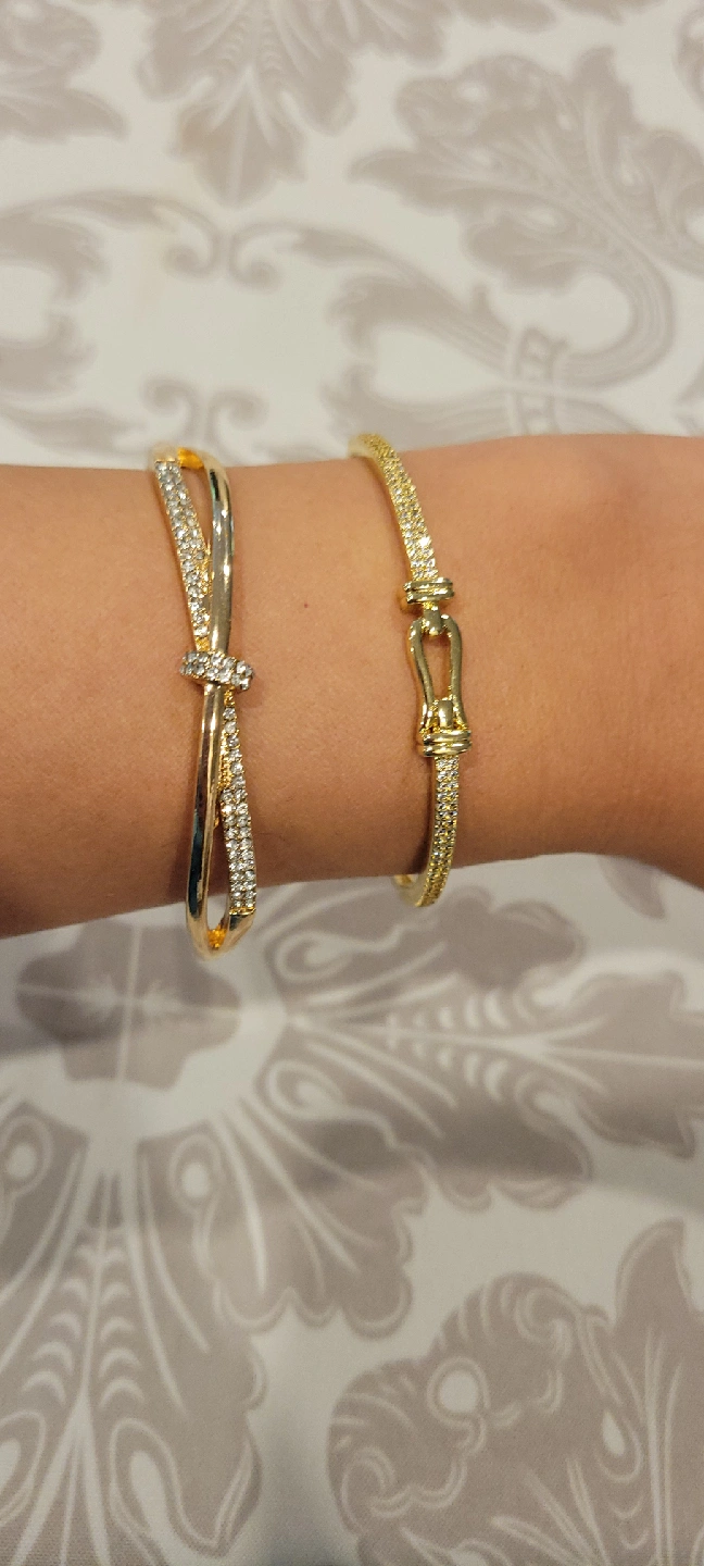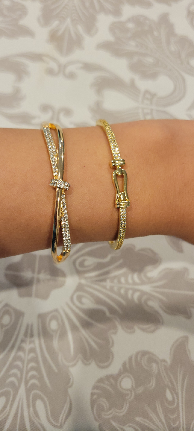Two gold-tone bracelets for sale! One is a cuff style with a criss-cross design and small stones, and the other is a bangle with a buckle design and small stones. They're in great condition and would be a lovely addition to any outfit